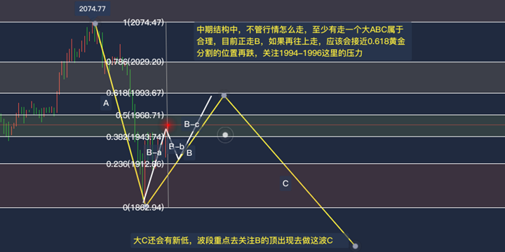 如图为短期结构,无论现在的行情怎么走,至少会走ABC出来,视2074-1862为A,目前正走B-b,高点还没出来出来,结合分割线去分析,如果属于大B,会很接近黄金分割0.618的位置1993附近,B走完后,还会有大C,也就是说后面还会有新低,波段交易者可以等B底部出来然后去做右侧交易,左侧交易不合适,可能B的反弹会无限接近年高点,所以不要轻易去做C,先关注1993-1996这里,一旦这里受阻可等回落至1968下方后做C,然后去拼新低。目前对于短期交易不顺利的同学可以关注笔者孙老师 sclc415寻求帮助。