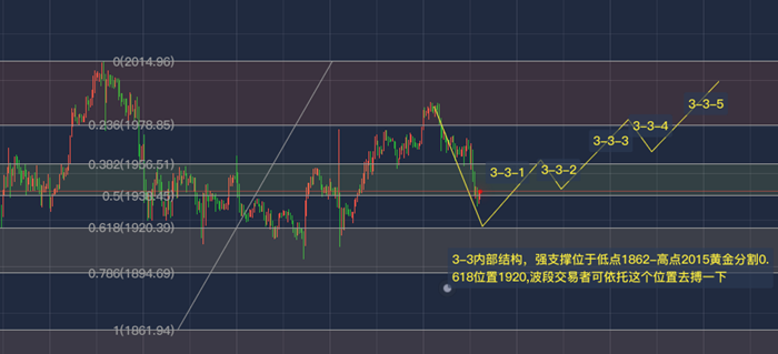 4、如上图为3-3内部结构,这也是今天周四大概率会走的走势,下方强支撑位于1862-2015黄金分割0.618位置1920一线,开盘预计以1932为起点去运行3-3内部结构,做短线交易者可回踩多思路去做,一旦3-3-1确定,节奏上面非常好把握,做波段的止损点放在凌晨止跌点1932一线。