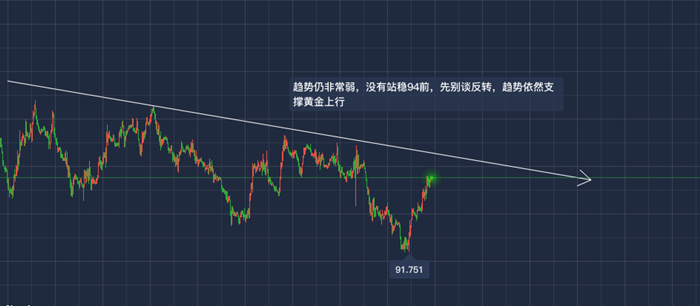 5、美元指数目前应该是大家比较关心的产品,可以去参考,但不能作为唯一依据,目前美元仍是空头趋势,低点逐步下移,反弹只是为了更好的下跌,在没有站稳94美元关口前,不要谈反转,趋势依然支撑黄金上行。很多人一直把美元当做分析黄金的工具,其实完全没有必要,金融市场没有永恒的逻辑,如果有的话,几百年前就被研究透了,根本不会等到今天。市场总会有背离,没有永久有效的逻辑。美元和黄金是可以同时上涨的,各自有不同的基本面驱动。如果任何行情都符合逻辑,就不会有泡沫,也不会有金融危机,面对市场千万不要一根筋。技术派经常会说背离,其实“背离”这个次,就解释了逻辑会失效。相关品种的逻辑仅仅是参考,一定不能成为唯一依据。