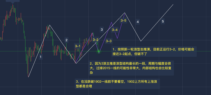 2、小结构上目前正运行3-2回落,价格回落可能会接近3-1起点1902一线,但不会跌破,这个上方全线看涨,无杠杆交易者不用对点位有过多的奢求,分批建仓即可,带杠杆轻仓进场即可,1902这个止损位置能接受就进,不能接受直到减小仓位到能接受为止。