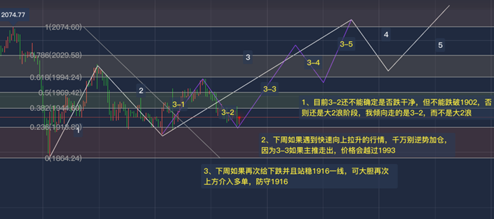 3、知道了中长期思路后我们再来说说小周期的走势,不会波浪理论的直接略过这段,看看这段里面的点位即可,如上图为4小时K线图,上周五价格止跌于2074-1862黄金分割0.236位置1912上方,图中非常详细,黄金目前价格到了非常关键位置,一旦继续下跌并破位1902,那空头还会继续放量,则说明还在大2浪阶段运行,如果止跌于1902上方,则行情直接进入3主推中,一旦进行3主推,1993必破无疑,幅度至少是3-1的1.5倍,3-1幅度为(1902-1992)90点,那么3主推力度要在135个点,3应对的位置从1916算,则是1916+135=2051上方,2074下方。所有依托周五低点1916全线看涨可搏,轻仓即可。我的倾向开始进入3-3主推中。对这波利润不知如何去抓或者手上有套单不知如何处理可关注笔者微信sclc415寻求帮助。