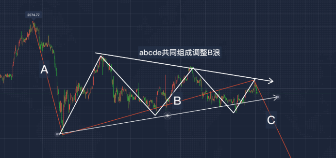 1、2074下跌到1862是下跌A浪,自1862到周四1966为止,三角形内部高点逐步降低,低点逐步抬高,走成abcde内部5浪盘整浪。