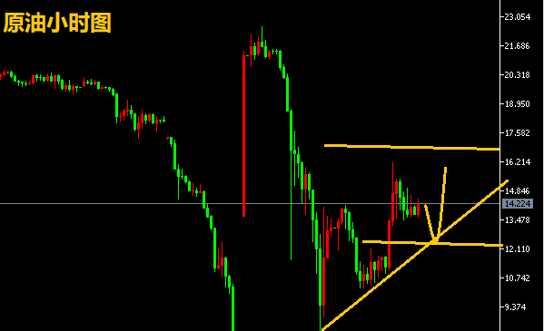 原油,4小时震荡后大跌;MACD死叉且指数跌至负值,KDJ死叉且指数位于30附近;短时间美原油走势仍以看空为主空。下方短时间关注12.4-10美金附近,这两个位置一旦下破将重新测试6.50。上方短时间关注16.3一线附近。若继续上破,阻力位看向19.20一线,若升破该点位,将重返19.20-30.00区间。金市良臣从原油日线图来看,日线收盘大阴线,高点没有破前高,低点破前低,出现落尾走势,均线空头排列,运行在k线上方形成压力,在趋势指标上显示,空头动能出现在放量中。RSI指标向下运行中处于超卖区域19水平位置中。整体表现空头趋势中。原油小时图显示,昨日原油在一波强势反弹后,原油最高触及16.30,随后原油短线走回调,最高给到了16.30附近水平出现遇阻迹象,油价继续出现下跌走势中,油价昨日触底反弹,力度相对较强势,若今日回撤不破新低,就会出现一波上涨反弹走势,综合来看金市良臣认为,若今日原油多头动能较强势,空头回撤只给到13.0附近得到支撑,同时上涨突破上方压力位16.30,那么原油大概率将改变当前偏空格局,今日操作上考虑高空低多策略,上方第一压力位是16.30,接下来就是18.0,下方关注13.2、10.2美元/桶支撑。