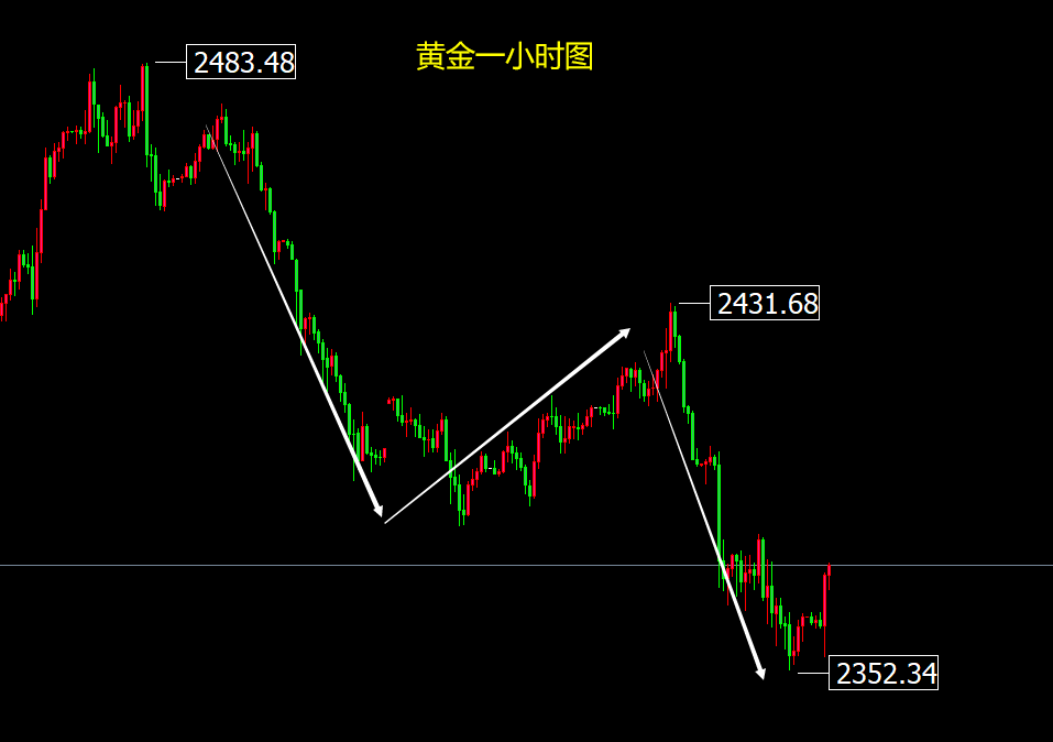 近日黄金在冲高2431后继续走弱,目前已跌至2352一线,已基本抵达我昨日看跌低点2350区域。