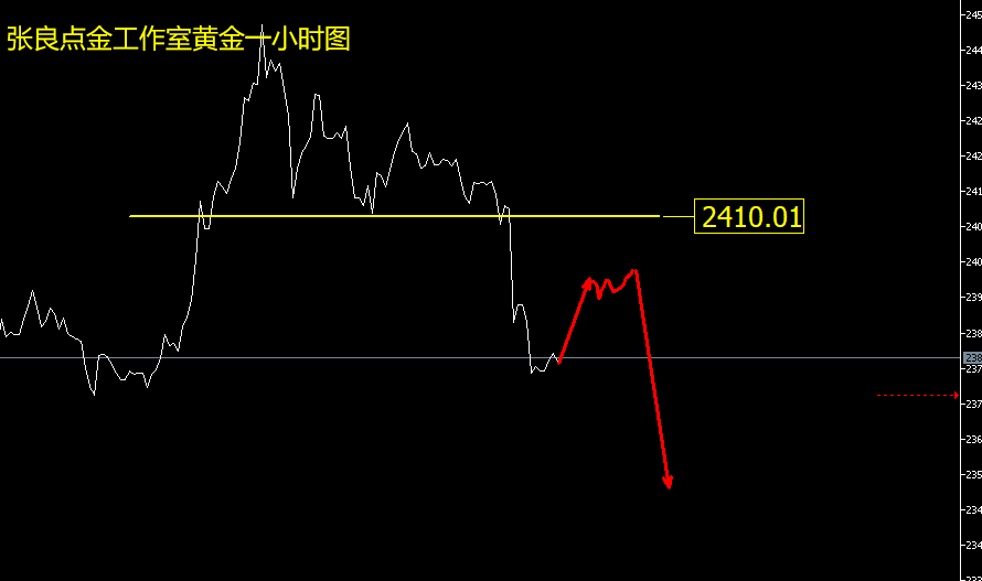 黄金还没跌到位!反弹仍是空! 不要着急抄底!依据形态办事,周三晚间价格跌破2410之后,一小时波段空头开启,目前这波调整仍未结束,一小时跌势良好,并未出现见底形态。当然,单线下跌的走势不会一直延续,反弹一定会有,但是不要去抄底,应该顺势做。所以,日内如果价格出现反弹,可关注五分钟形态变化,如