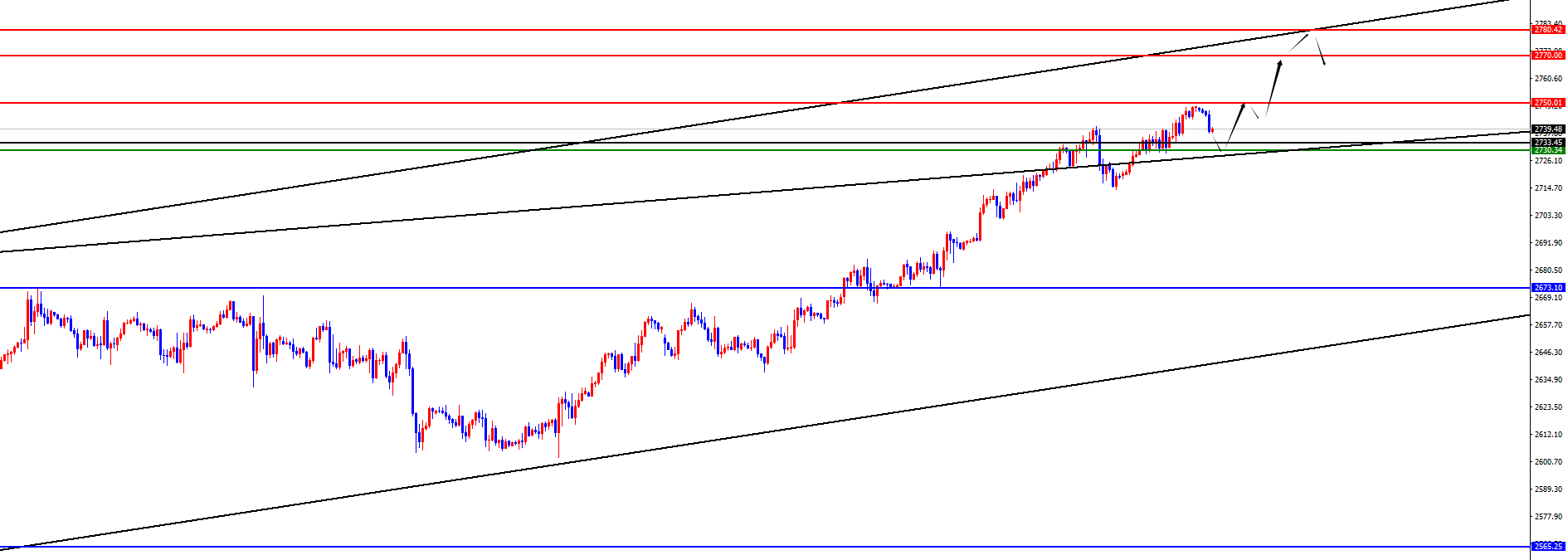 黄金方面,周二黄金价格总体呈现上涨的状态,当日价格最高上涨至2748.77位置,最低下跌至2718.76位置,收盘于2748.74位置。回顾周二黄金市场表现,早间开盘后价格短线受撑于四小时支撑直接上行,随后欧盘期间震荡后美盘再度发力上行,价格再创历史新高位置。从最终收盘看大阳收尾,同时短期节奏上则关注四小时支撑得失,价格不破四小时支撑则继续右侧交易方式多对待,只有后续下破后才进一步看下跌,目前暂时关注2730-2733区间支撑,上方关注2750-2770,如若强势的话关注2780区域,后续重点关注价格到达2770-2780区间能否再度修正是关键,操作上则按照右侧交易方式关注四小时支撑得失决定操作方向。