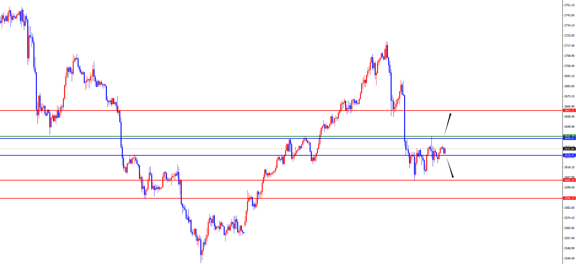 黄金2626-2642区间震荡,破位后跟随(目前更偏向于上破)
