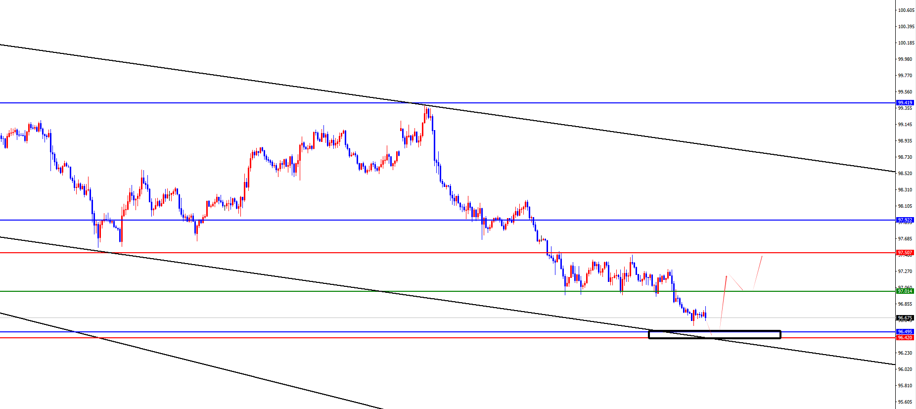 从多周期分析,周线级别来看价格压制在99.40区域阻力,那么从中期视角出发,美元指数的走势将更偏向于空头。在日线级别上随着时间的推移价格关键阻力位置于97.90位置,目前价格在此位置下方,所以暂时我们需要关注进一步延续,但是目前价格接近上涨趋势线支撑区域,后续需要关注趋势线支撑情况。同时四小时上价格持续承压,短线暂时需要关注97区域阻力,价格在此位置之下偏空对待,但是暂时虽然偏空,需要注意市场探底回升表现。另外从短线下跌通道看,下方96.40-96.50区域同样是通道下边缘位置,所以后续需要重点关注此位置能否支撑上涨是关键。