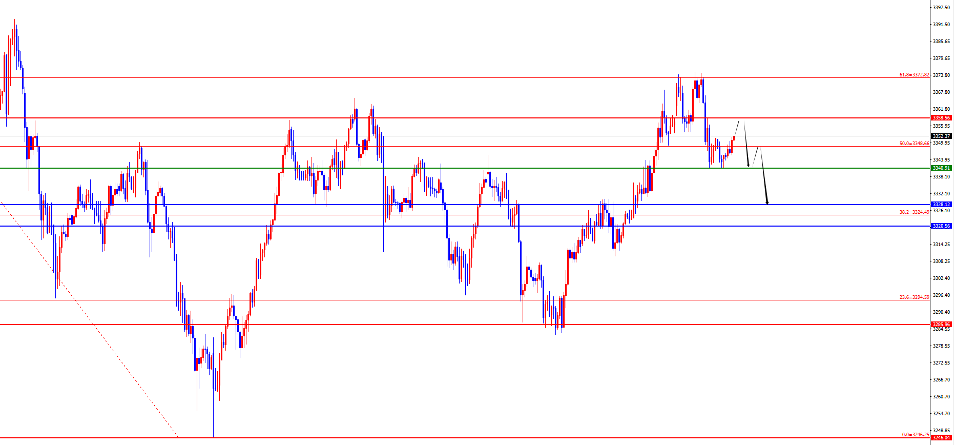 从多周期分析,首先观察月线节奏,价格在5月份正如笔者所言按照节奏运行,并且最终十字状态,6月份最终价格依旧是反K状态收尾,所以针对多依旧需要谨慎对待。从周线级别看,周线上近期价格持续高位震荡,随着时间的推移周线分水岭暂时于3320-3322位置,对于后续价格周线收盘在此位置将进一步承压,否则的话还是按照高位震荡。按照日线级别看,价格在上周五突破日线级别阻力位置,所以波段上目前处于偏多,昨日价格如期于下跌回撤的618位置止步下跌,并且最终日线大阴收尾,后续需要关注3328波段分水岭得失。按照四小时级别看,上周四价格站稳四小时阻力位置,目前维持在四小时支撑上方运行,四小时是短期走势的关键,从位置上看四小时关键支撑于3340位置,价格在此位置之上短期偏多,价格后续下破后将短线延续。一小时上价格在昨日顺利下跌后,目前有短线调整的迹象,所以暂时不追但,上方重点关注3358区域阻力,待价格到位后再关注能否进一步承压是关键。
