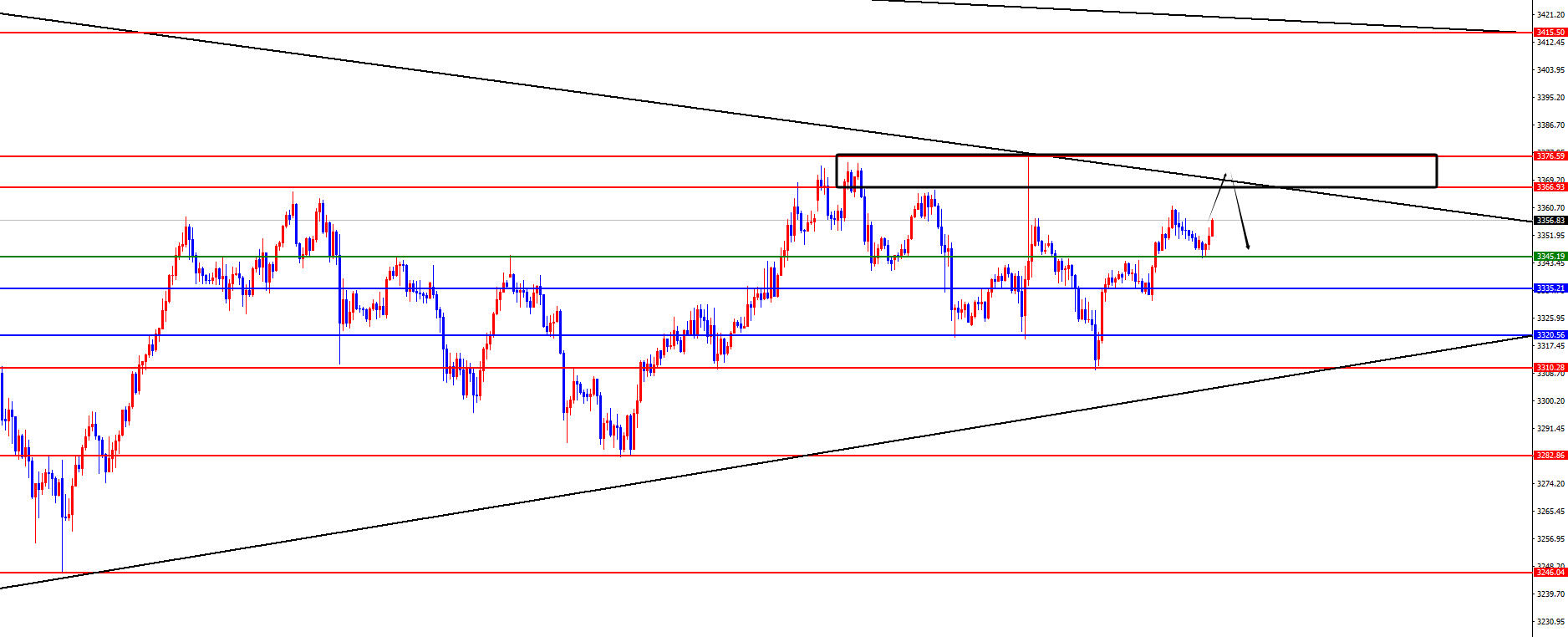 黄金3320-3377区间震荡,待3366-3377区间出现反K后空