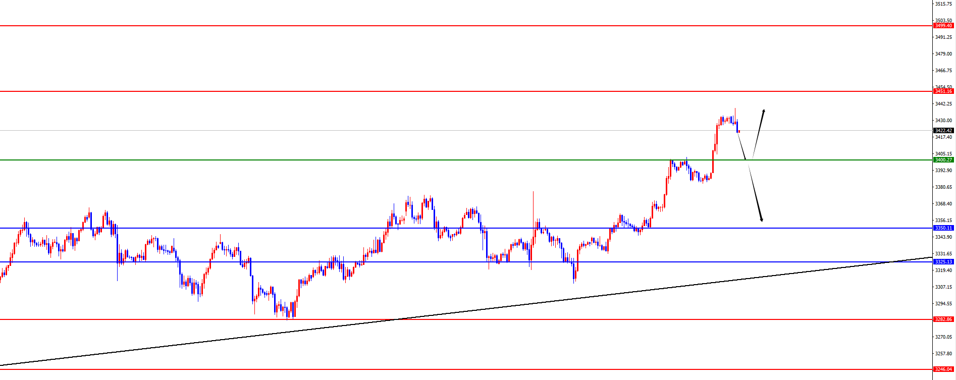 从多周期分析,首先观察月线节奏,价格在5月份正如笔者所言按照节奏运行,并且最终十字状态,6月份最终价格依旧是反K状态收尾,针对目前需要关注月线高点得失。从周线级别看,周线上近期价格持续高位震荡,随着时间的推移周线分水岭暂时于3325位置,价格在此位置之上偏多,对于后续价格周线收盘在此位置将进一步承压,目前市场依旧维持高位震荡。按照日线级别看,上周价格在日线支撑位置上方运行,价格虽然多次回踩但是最终没有下破,目前价格在日线支撑3350位置上方暂时关注震荡偏多,价格下破后才会延续。按照四小时级别看,目前价格还是依托四小时支撑进一步上涨,位置上暂时关注3400区域支撑,此位置不破偏偏多对待,但是后续一旦下破需要注意后续调整。从一小时上看昨日价格强势收盘,今日亚盘冲高回落跌破早盘低点位置,则暂时不是极强的方式,短线价格有继续调整的表现,所以暂时切勿追多,重点关注3395-3400区间支撑,目前目前接近月线高点及历史高点,后续依旧需要谨慎对待。