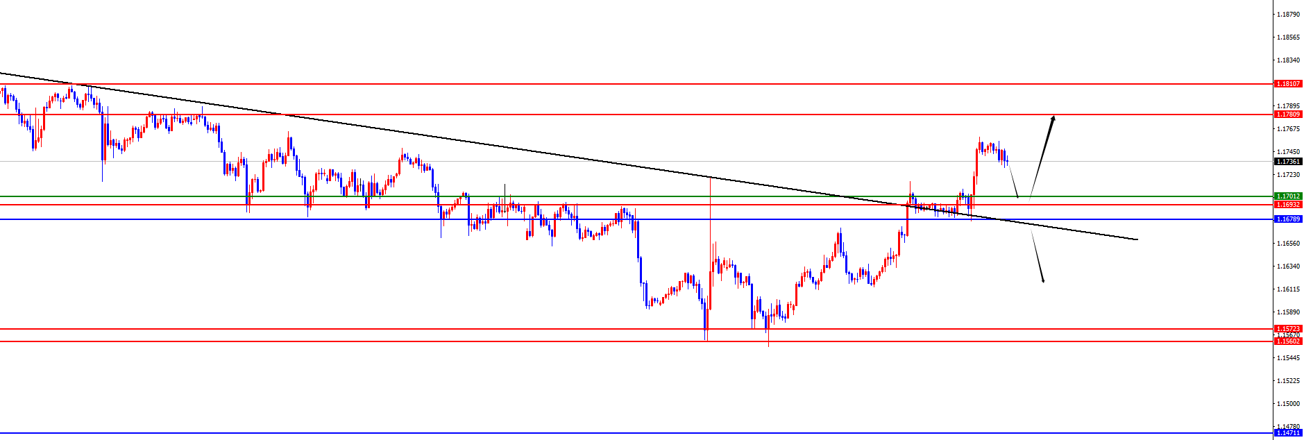 从多周期分析,从月线级别来看,欧美受撑于1.0950位置,所以长线多头对待,月线大阳收尾,则长线上依旧偏多。从周线级别看价格受撑于1.1470区域的支撑,从中线的角度持续看多,价格下跌暂时作为中线上涨中的修正对待。从日线级别,价格在前期跌破日线支撑,则目前价格压制在日线阻力下方运行,同时在昨日收盘再度收盘在日线阻力位置上方,则后续需要关注能否进一步延续上涨是关键,位置上暂时重点关注1.1680分水岭,今日整体上可以作为过渡日对待,关注最终收盘表现。从四小时级别看暂时需要关注1.1700区域支撑,价格在此位置之上短线偏多,暂时先按照右侧交易方式对待。一小时上价格短线有向下调整的表现,所以暂时不追多,等待价格回踩四小时支撑后布局多,同时如若意外下破日线支撑需要继续关注空延续,否则的话右侧多为主。