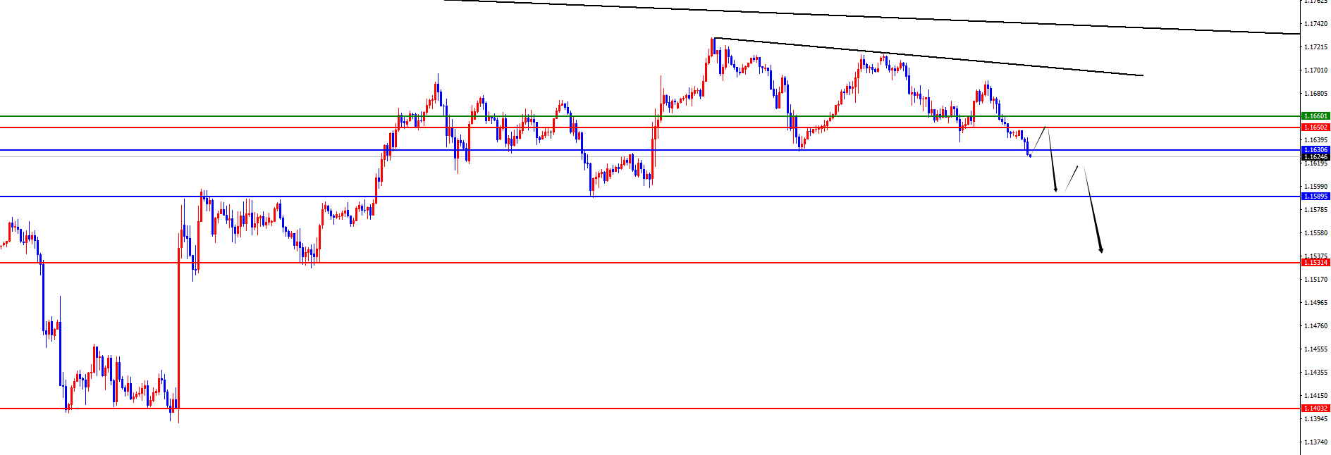 从多周期分析,从月线级别来看,欧美受撑于1.0950位置,所以长线多头对待,月线大阴收尾,所以目前看多的同时需要注意市场的调整。从周线级别看价格受撑于1.1590区域的支撑,从中线的角度持续看多,价格下跌暂时作为中线上涨中的修正对待,同时在近期需要关注进一步回踩并且关注能否下破是关键。从日线级别,随着时间的推移目前日线支撑于1.1630位置,目前此位置已经进行刺破,后续关注实际收盘在此位置下方。按照四小时级别看,价格在周初跌破四小时阻力后价格持续承压,位置上暂时关注1.1650-60区间阻力,所以价格在四小时阻力下看承压即可。一小时上欧盘早盘再度下破前一日低点位置,价格如若极弱的话早盘高点将持续压制,否则保守者继续关注四小时阻力压制,下方关注1.1590-1.1530区域。