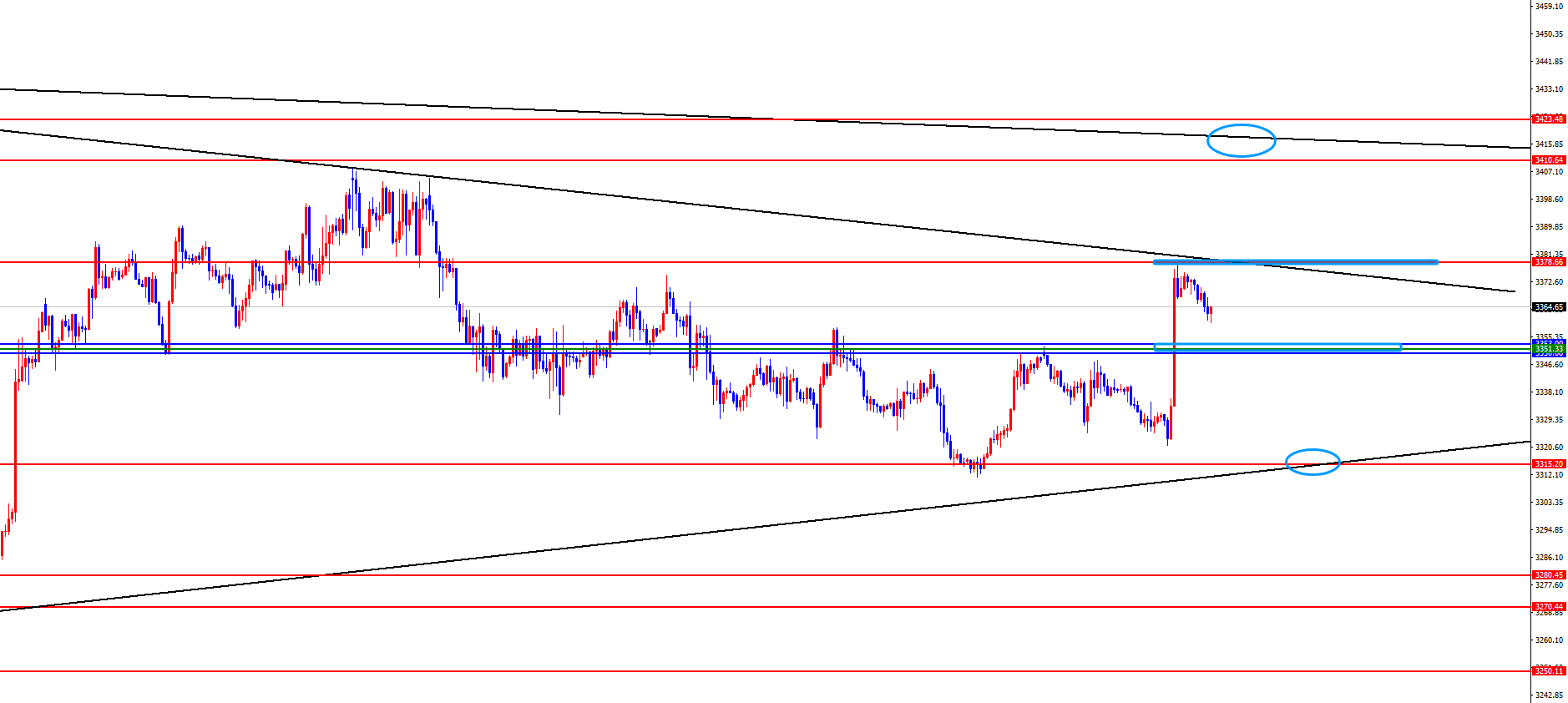 从多周期分析,首先观察月线节奏,价格在近几个月在高位持续震荡,所以在没有突破前高之前多头需要谨慎对待。目前月线多空分水岭位置于2920位置,短期看上个月高低点得失成关键。从周线级别看,周线上近期价格两阴两阳震荡运行,但是上周最终收盘看没有收阴,所以需要关注后续节奏的表现。目前看周线分水岭于3350位置,价格只有收盘在此位置下方才真正转空。从日线级别看,目前价格维持在三角形震荡收缩区间运行,目前收缩区间关注3410-3315区间,价格突破区间后才会延续。位置上目前3353位置是波段走势的分水岭。从四小时上看目前需要关注3350区域分水岭,此位置是短期走势的分水岭。一小时上看价格在经过上周五大幅上涨后目前需要调整,所以在没有突破上周五高点之前暂时谨慎追多,重点关注多周期共振支撑3350-3353区间得失。