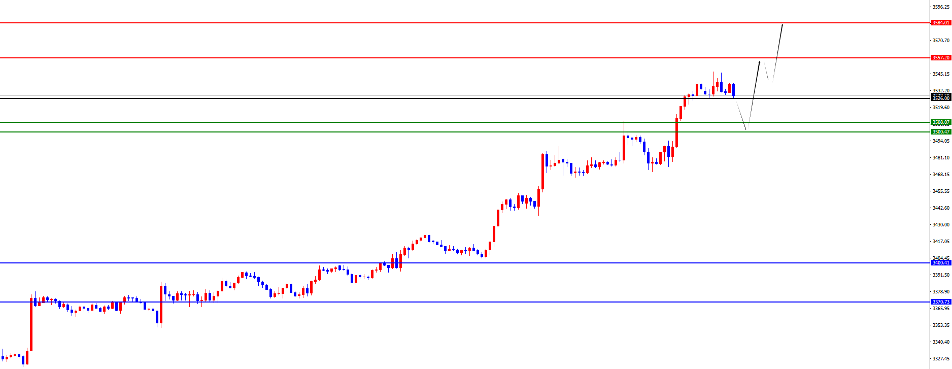 黄金3500-08区间出现反K看多头延续,目标3557-3584