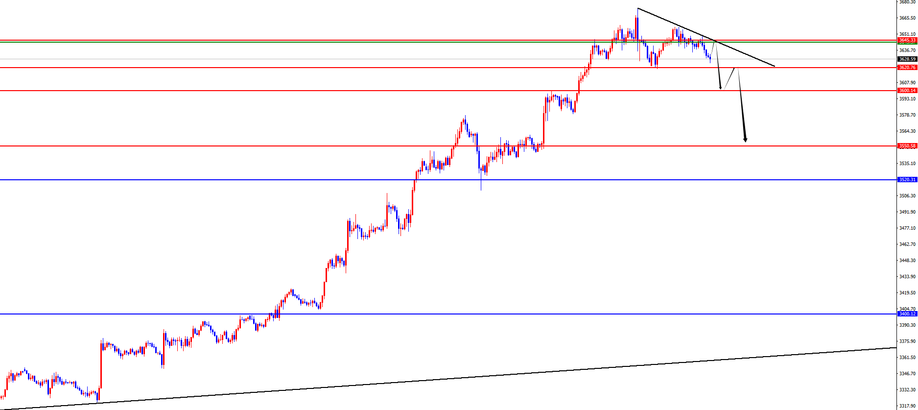 从多周期分析,首先观察月线节奏,月线上价格8月份大阳收尾,整体看价格依旧多头运行,从长线上看3000位置是长线走势的分水岭,价格在此位置之上长线多对待即可。从周线级别看,价格经过近期持续震荡后突破关键阻力,目前持续再创历史新高位置,目前周线多空分水岭于3400位置,价格在此位置之上中线多对待即可。从日线级别看,暂时需要关注3518区域支撑,此位置之上波段多对待。从四小时上看,前期价格维持在四小时支撑上方运行,但是昨日跌破此区域,所以目前3644-3645区间成为关键阻力,后续关注此位置承压。一小时上看目前价格延续承压,后续重点关注3620-3600区域,如若极弱的表现下则关注3550-3520区域。