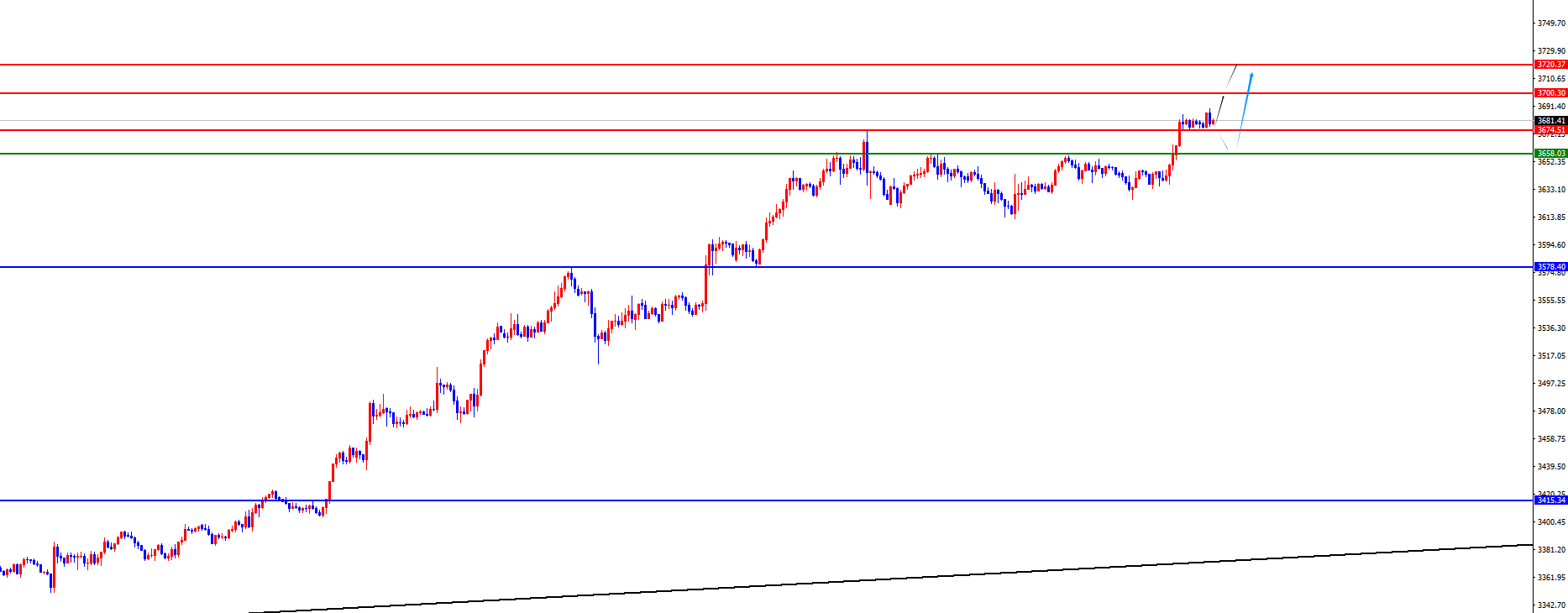 从多周期分析,首先观察月线节奏,月线上价格8月份大阳收尾,整体看价格依旧多头运行,从长线上看3000位置是长线走势的分水岭,价格在此位置之上长线多对待即可。从周线级别看,价格经过近期持续震荡后突破关键阻力,目前持续再创历史新高位置,目前周线多空分水岭于3415位置,价格在此位置之上中线多对待即可。从日线级别看,暂时需要关注3578区域支撑,此位置之上波段多对待。从四小时上看,在上周尾几天价格维持在四小时支撑上下盘整,昨日突破四小时阻力后再度发力,则四小时支撑依旧是关键,位置上目前重点关注3657-3658区间支撑,价格在此位置之上多对待。同时一小时上在前一日强势收盘,今日亚盘期间再度依托前一日凌晨回撤的低点位置再创新高,则目前看昨日凌晨回撤的低点位置成关键分水岭,价格在没有下破前强势多对待,意外下破则关注四小时支撑看上涨,上方关注3690-3720区域。