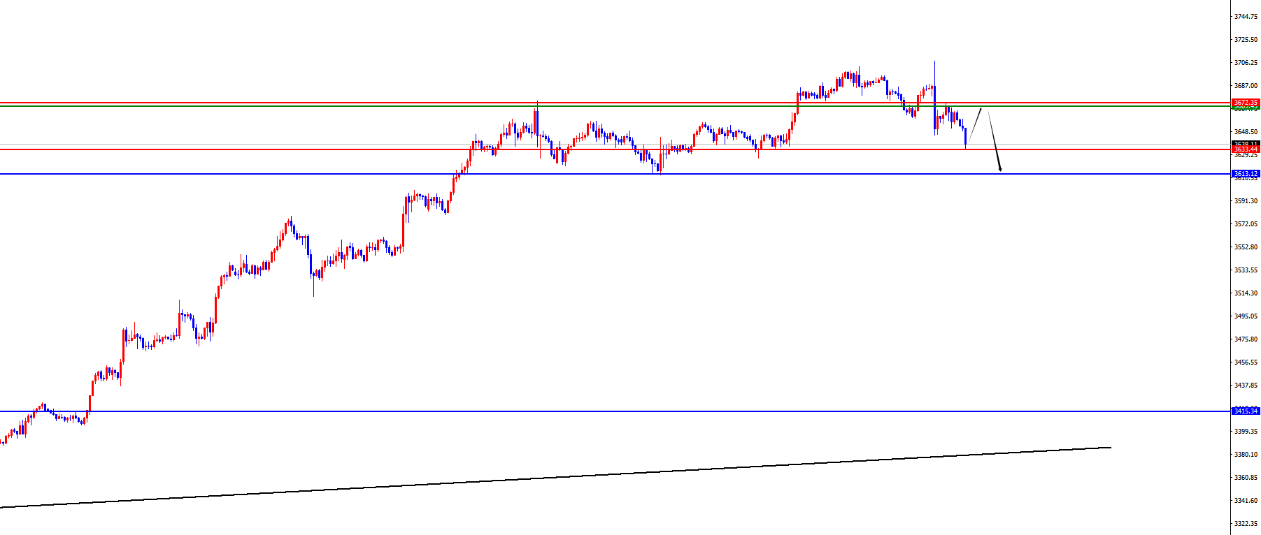 从多周期分析,首先观察月线节奏,月线上价格8月份大阳收尾,整体看价格依旧多头运行,从长线上看3000位置是长线走势的分水岭,价格在此位置之上长线多对待即可。从周线级别看,价格经过近期持续震荡后突破关键阻力,目前持续再创历史新高位置,目前周线多空分水岭于3415位置,价格在此位置之上中线多对待即可。从日线级别看,暂时需要关注3610-3613区域支撑,此位置之上波段多对待。从四小时上看,在本周一价格突破四四小时阻力后持续上涨,随着时间的推移目前四小时支撑于3674位置,此位置是短期的关键分水岭,昨日价格如期下破此位置,随着时间的推移目前四小时阻力于3670-3672区间,价格在此位置之下偏空对待,下方关注3633-3613区域,之后重点关注日线分水岭得失。