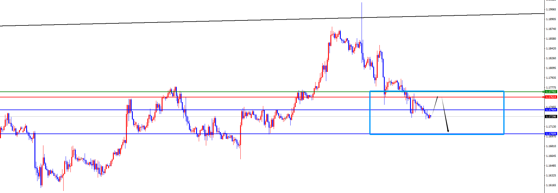 从多周期分析,从月线级别来看,欧美受撑于1.1060位置,所以价格在此位置之上长线多头对待。从周线级别看价格受撑于1.1700区域的支撑,此位置是中线走势的多空分水岭,目前有下破周线支撑的表现,所以后续重点关注。从日线级别,随着时间的推移目前日线阻力于1.1740位置,此位置作为波段走势的关键分水岭。同时按照四小时级别看,随着时间的推移目前四小时阻力于1.1760-70区间阻力,价格在此位置之下短期偏空。结合看目前重点关注周线支撑1.1700及四小时阻力1.1770区间,价格打破区间后将进一步延续。