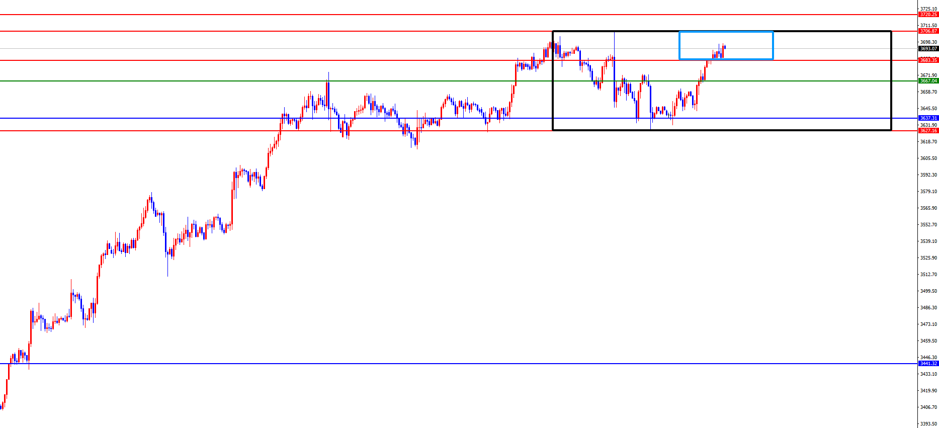 从多周期分析,首先观察月线节奏,月线上价格8月份大阳收尾,整体看价格依旧多头运行,从长线上看3000位置是长线走势的分水岭,价格在此位置之上长线多对待即可。从周线级别看,价格经过近期持续震荡后突破关键阻力,目前持续再创历史新高位置,目前周线多空分水岭于3441位置,价格在此位置之上中线多对待即可。从日线级别看,暂时需要关注3637区域支撑,此位置之上波段多对待。从四小时上看,上周五价格突破四小时阻力,则短线价格偏多,但是目前市场有在3627-3707区间震荡,所以在没有突破前期历史高位之前也要谨慎对待。下方3665位置为短期走势分水岭。一小时上价格目前多头还没有节奏,早盘低点成关键,所以目前短线先关注早盘低点及前期历史高位区间得失,打破此小区间才会进行延续,所以目前多看少动,待价格打破小区间后进行看延续。