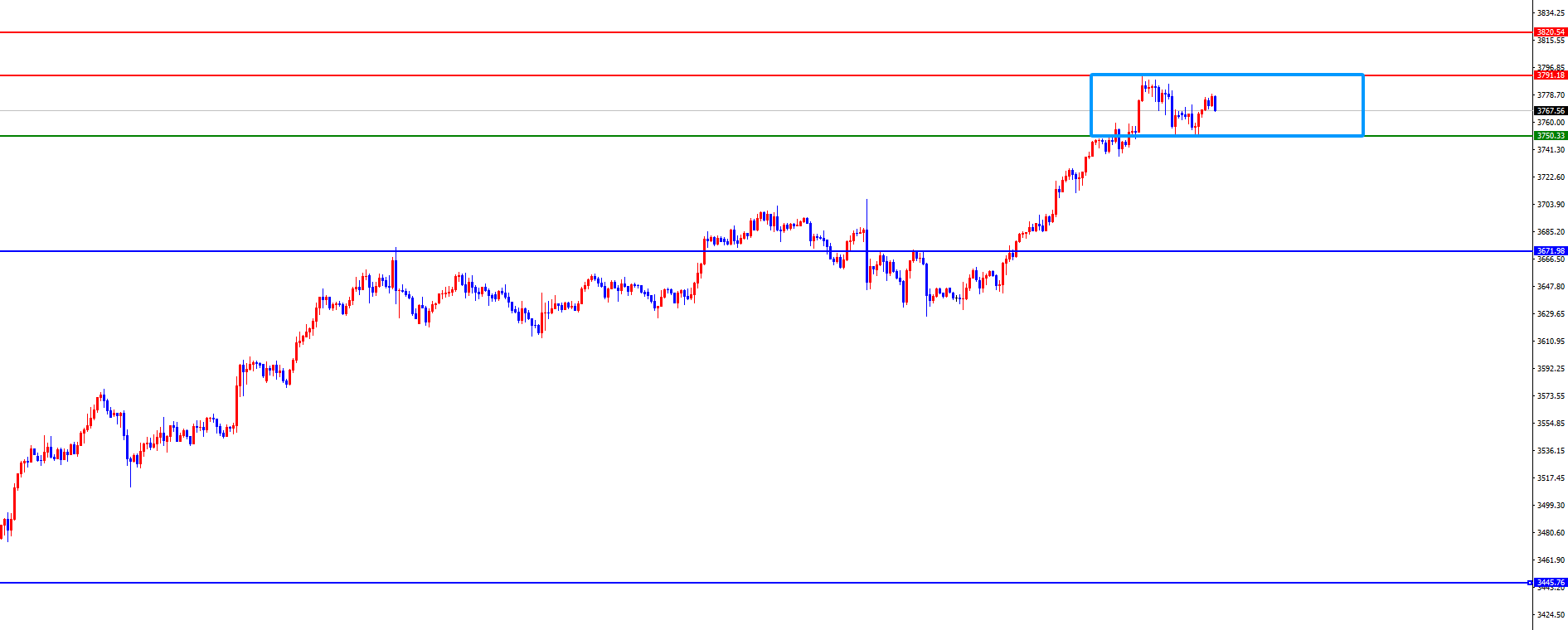 从多周期分析,首先观察月线节奏,月线上价格8月份大阳收尾,整体看价格依旧多头运行,从长线上看3000位置是长线走势的分水岭,价格在此位置之上长线多对待即可。从周线级别看,价格经过近期持续震荡后突破关键阻力,目前持续再创历史新高位置,目前周线多空分水岭于3445位置,价格在此位置之上中线多对待即可。从日线级别看,暂时需要关注3671区域支撑,此位置之上波段多对待。从四小时上看,价格短期维持在四小时支撑上强势拉升,今日早盘期间价格回踩测试到四小时支撑3750位置,此位置得失决定后续能否延续上涨的关键。一小时上目前价格有偏向于3750-3790区间震荡,所以目前切勿盲目看大涨大跌,短线上还有修正,所以暂时关注早盘低点得失,没有下破前看短线延续,需要注意收割,一旦下破需要关注调整表现。