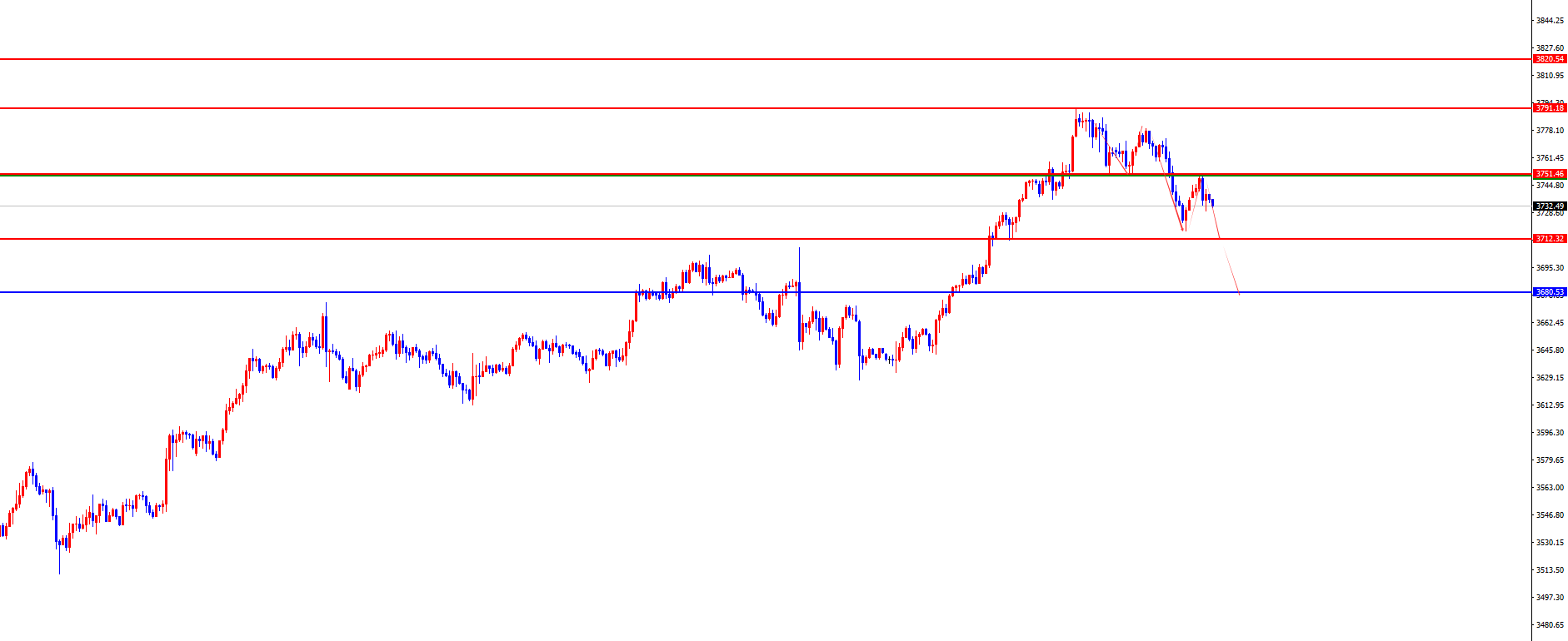 黄金3750-3755区间空,防守10美金,目标3712-3680