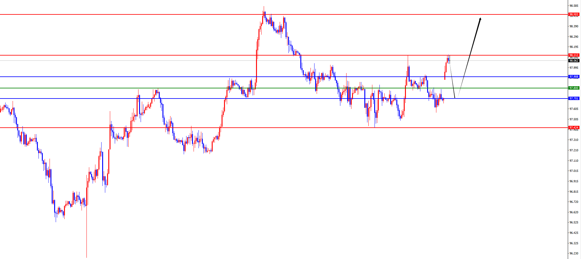 美元指数 在美元指数的表现上,上周五美元指数呈现出下跌的态势。当日美元指数价格最高攀升至97.928的位置,最低则下探至97.569位置,最终以97.698的价格收盘。回顾上周市场整体表现,价格在上周呈现出震荡的表现,价格持续依托日线支撑及周线阻力区间运行,但是整体美指处于筑底的表现,所以本周开盘后价格发