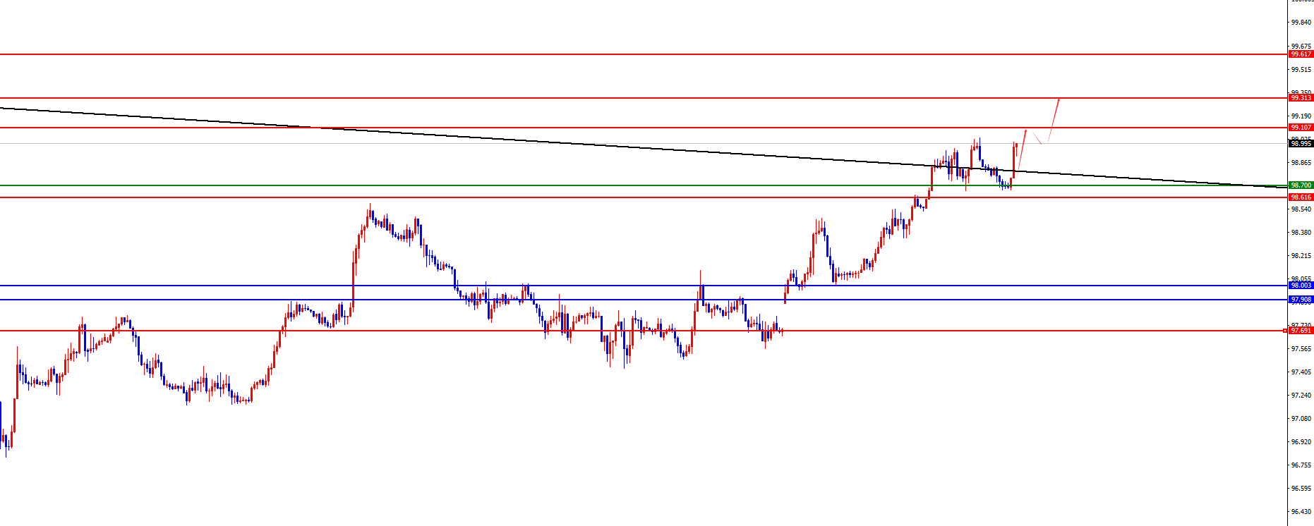 美元指数 在美元指数的表现上,周三美元指数呈现出上涨的态势。当日美元指数价格最高攀升至99.036的位置,最低则下探至98.525位置,最终以98.828的价格收盘。回顾周三市场整体表现,价格在早盘期间继续强势飙升,虽然欧盘震荡调整,但是美盘有依旧再度强势,最终当天大阳状态收尾。 从多周期分析,周