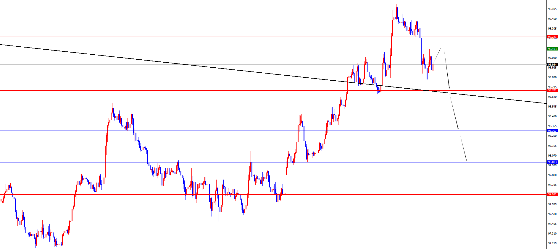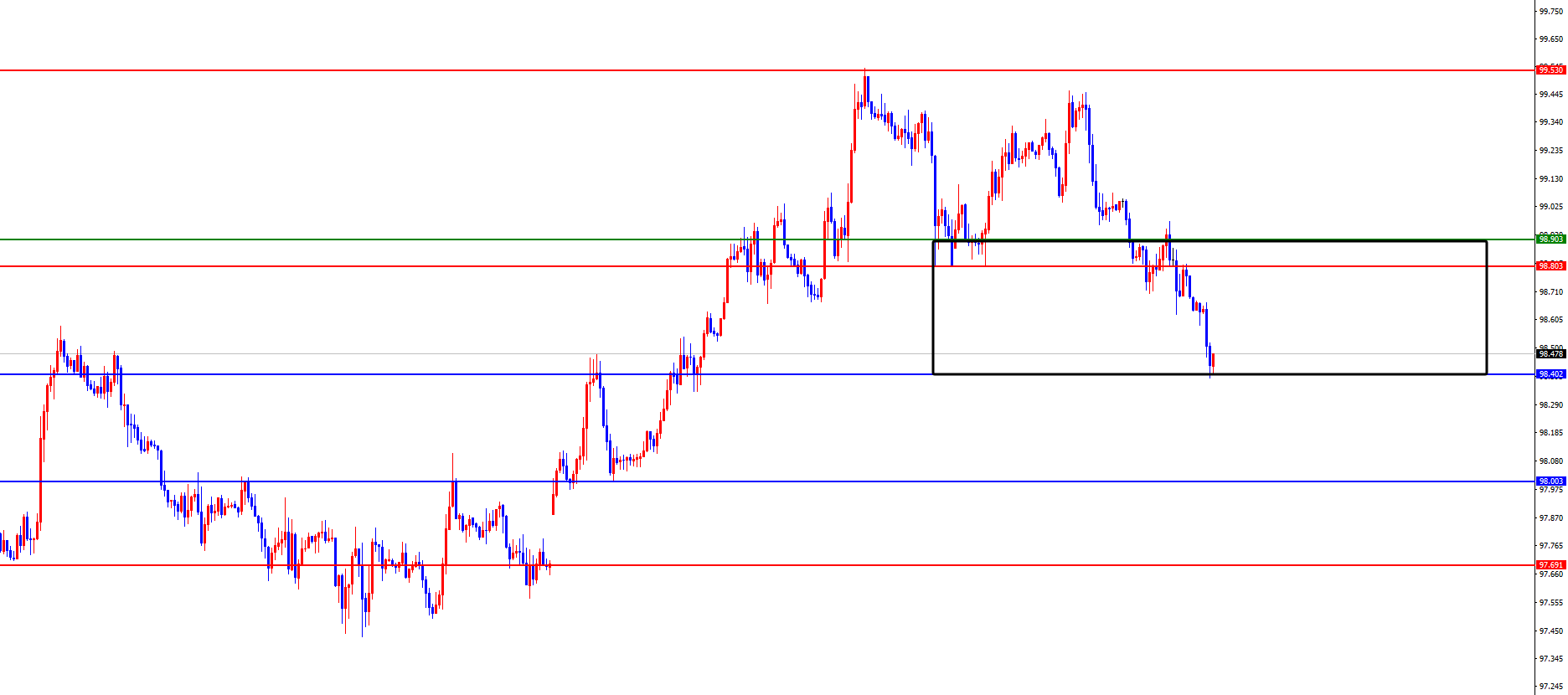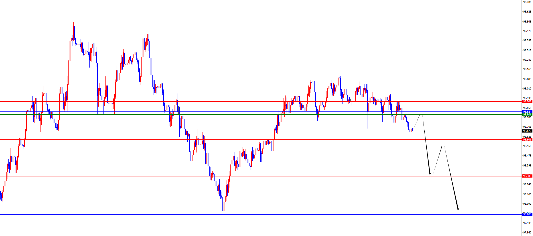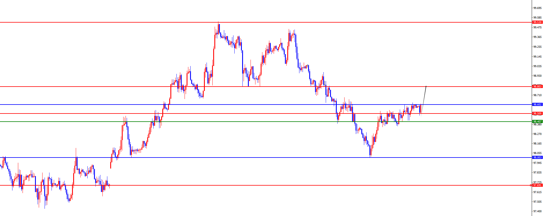 美元指数 在美元指数的表现上,上周五美元指数呈现出下跌的态势。当日美元指数价格最高攀升至99.443的位置,最低则下探至98.807位置,最终以98.81的价格收盘。回顾上周五市场整体表现,价格在早盘期间承压于前一日高点位置,之后持续承压,并且于美盘后跌破四小时支撑位置,则短线偏承压,同时日线上大阴收尾。