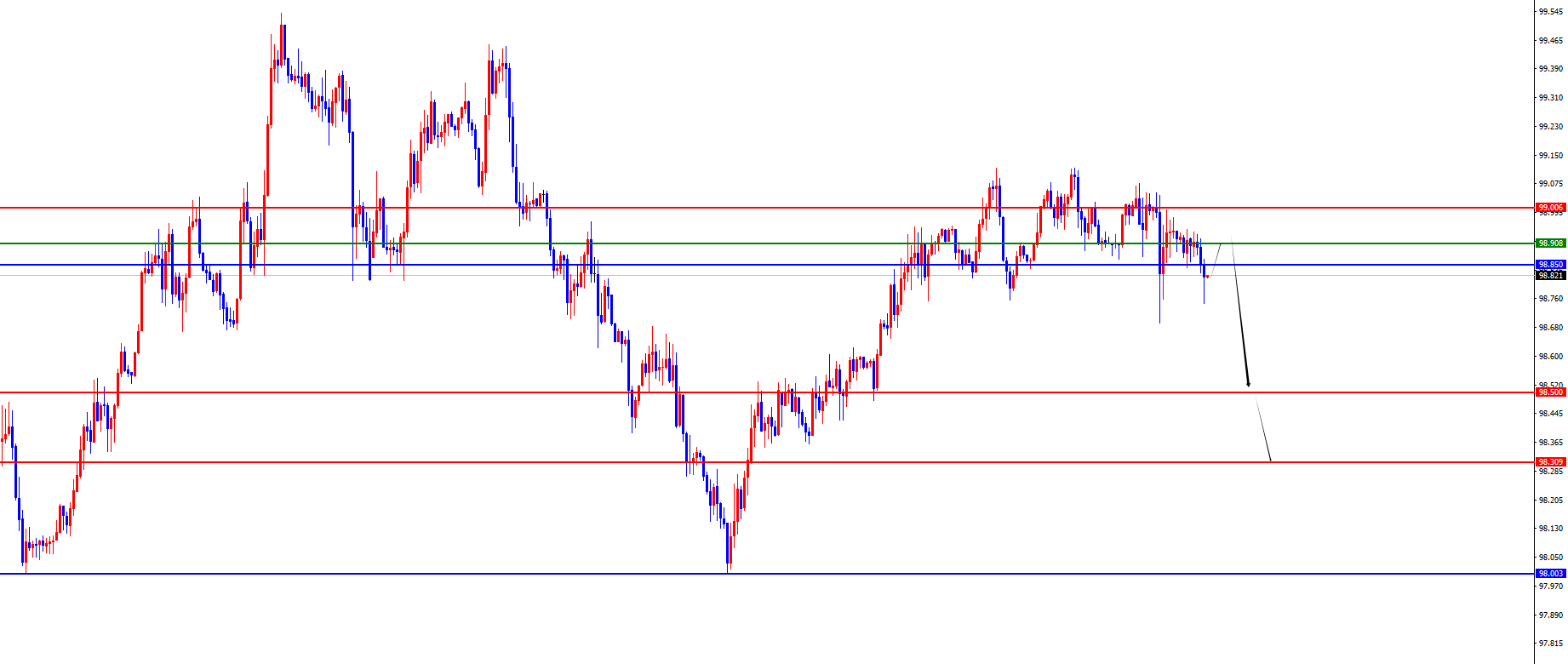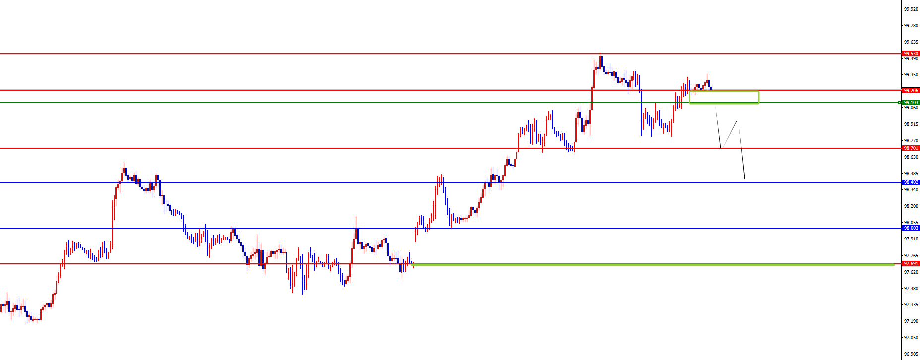 美元指数 在美元指数的表现上,周三美元指数呈现出下跌的态势。当日美元指数价格最高攀升至99.056的位置,最低则下探至98.624位置,最终以98.64的价格收盘。回顾周三市场整体表现,价格在早盘期间短线压制在前一日凌晨回撤的高点位置,之后价格延续承压,最终当天大阴收尾。 从多周期分析,周线价格经