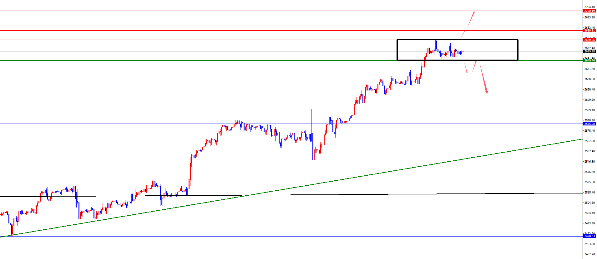 【黄金】 黄金方面,上周五黄金价格总体呈现下跌的状态,当日价格最高上涨至2674.17位置,最低下跌至2643位置,收盘于2658.66位置。回顾上周五黄金市场表现,早间开盘后价格先进行承压,随后欧盘短线修正不破早盘高点,美盘再度加速下跌,从位置及时间上符合后续下跌的表现,价格破位四小时支撑位置,同时日线
