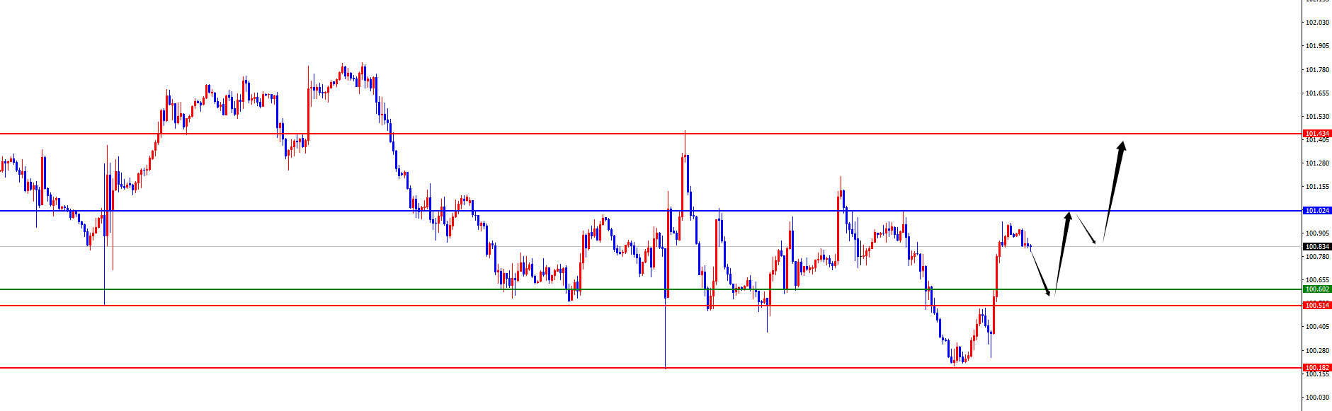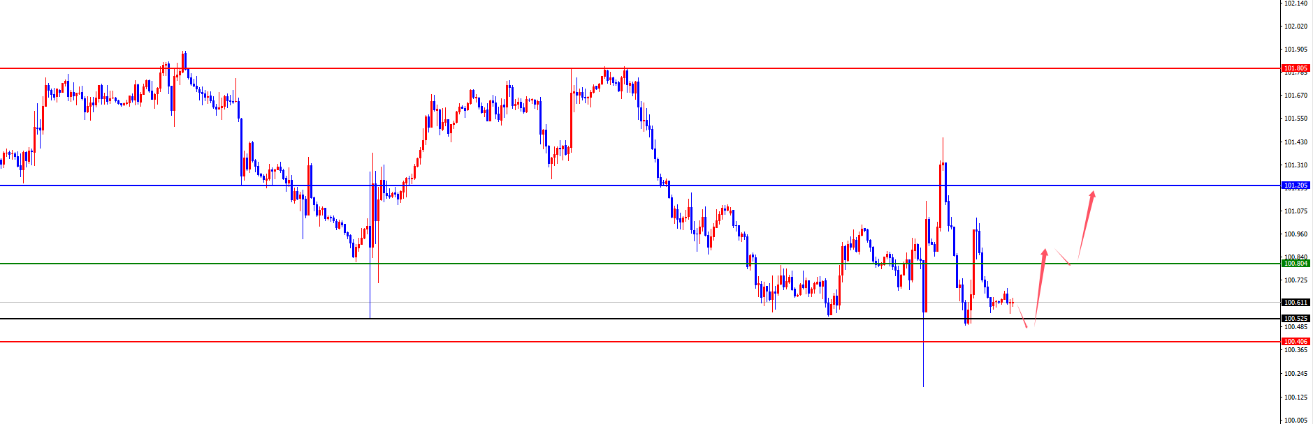 【美元指数】 美元指数方面,周四美元指数价格总体呈现下跌的状态。当日价格最高上涨至101.452位置,最低于100.49位置,收盘于100.614位置。回顾周四美指价格表现,昨日早间开盘后价格呈现出上涨的状态,随后价格突破日线阻力位置后再度承压下跌,最终日线大阴状态收尾,对于目前日线级别看暂时需要关注101.20