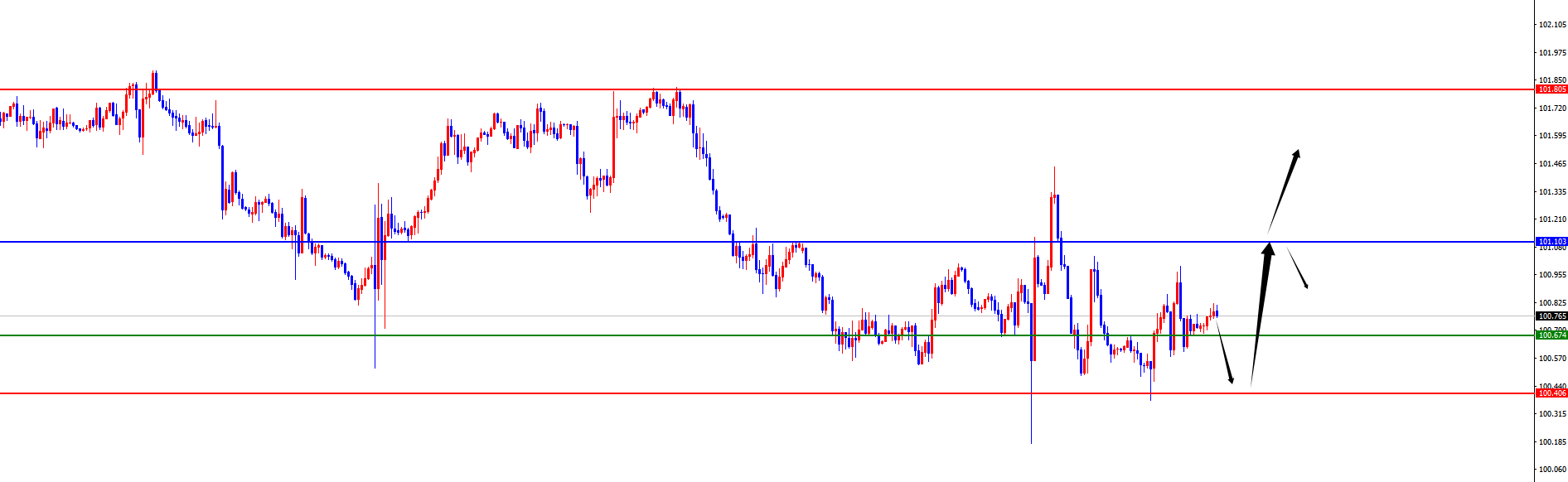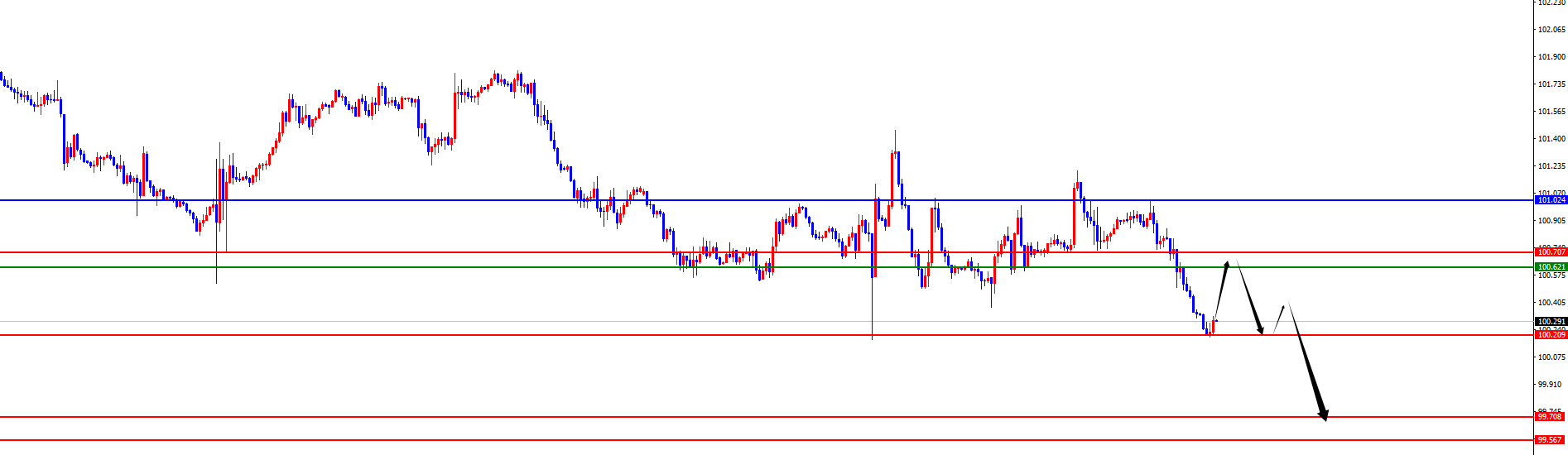 美元指数方面,周二美元指数价格总体呈现下跌的状态。当日价格最高上涨至101.025位置,最低于100.314位置,收盘于100.336位置。回顾周二美指价格表现,早间开盘后价格先向上修正,随后触及至日线阻力位置后承压下行,时间点也是在欧盘时间,随后价格持续延续性下跌并且再测近期低点附近,最终日线大阴收尾,目前看美指后