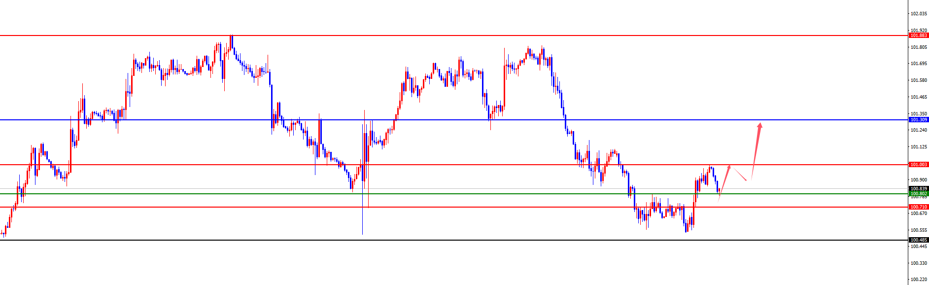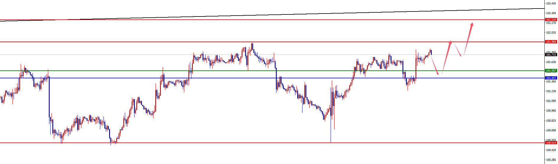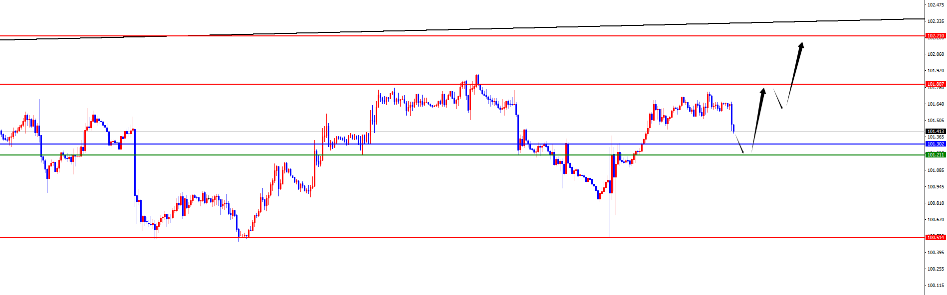 【美元指数】 美元指数方面,周三美元指数价格总体呈现探底回升的状态。当日价格最高上涨至101.799位置,最低于101.24位置,收盘于101.712位置。回顾周三美指价格表现,针对美指在上周上破日线级别阻力位置,随后进行震荡修正,同时昨日如期进行探底测试日线支撑后上行,价格在日线关键位置形成顶底转换,日线