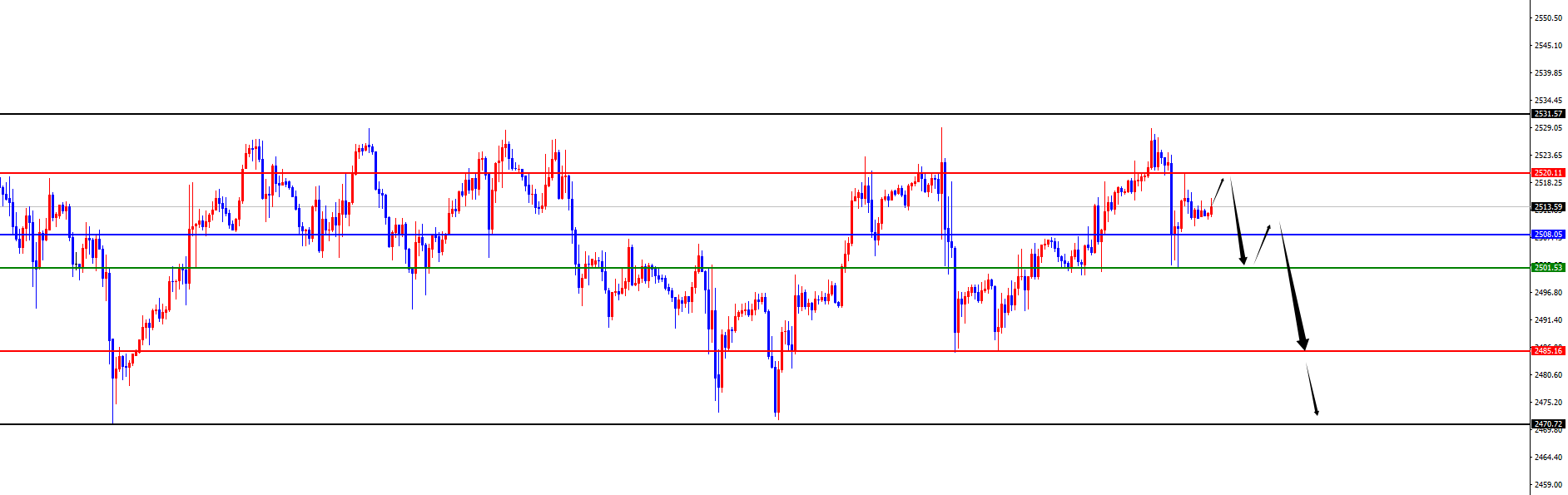 【黄金】 黄金方面,周三黄金价格总体呈现冲高回落的状态,当日价格最高上涨至2528.91位置,最低下跌至2500.84位置,收盘于2511.29位置。回顾周三黄金市场表现,早间开盘后价格短线先进行延续性上涨,当价格触及至昨日我们布局空的区域后止步,随着欧盘价格震荡下跌,表明上涨力度不足,随后美盘CI数据公布后加