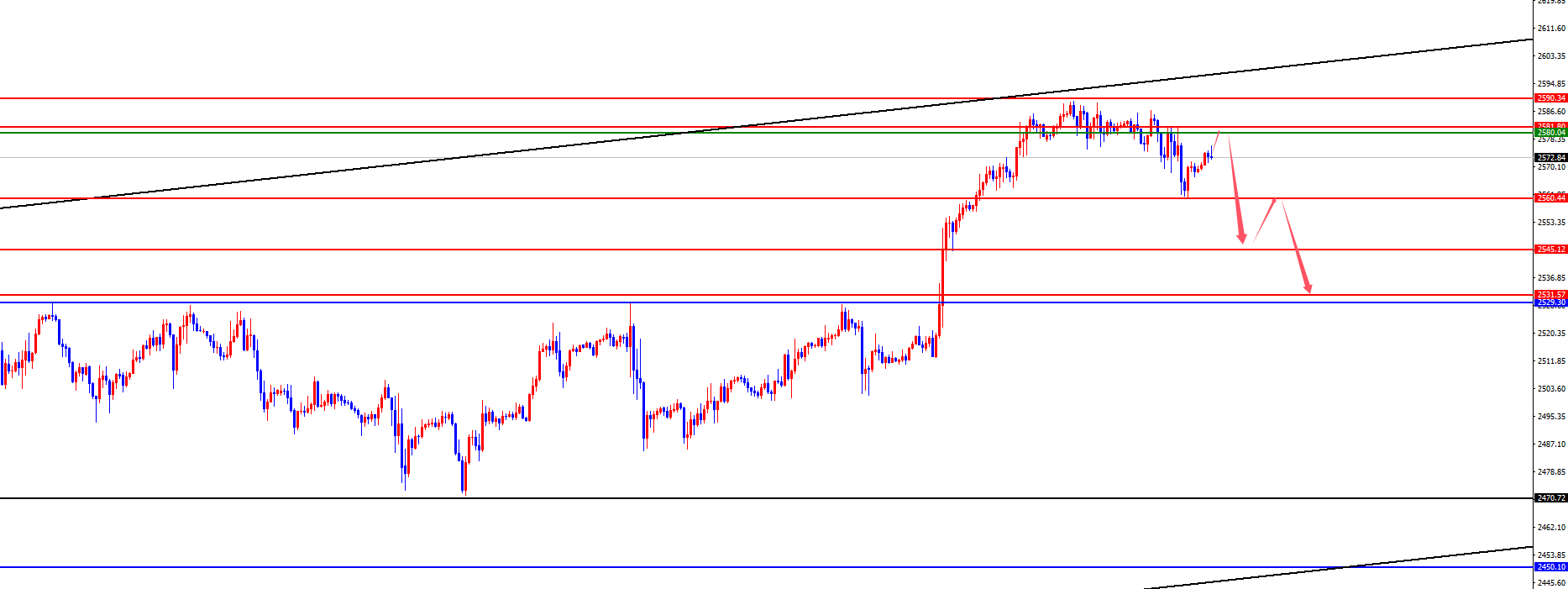 【黄金】 黄金方面,周二黄金价格总体呈现下跌的状态,当日价格最高上涨至2586.82位置,最低下跌至2560.66位置,收盘于2569.34位置。回顾周二黄金市场表现,日内亚盘期间震荡为主,价格持续压制于前一日高点位置下方,同时在欧盘期间价格进行下破前一日低点四小时支撑位置,如若按照时间和空间结合的话后续还有