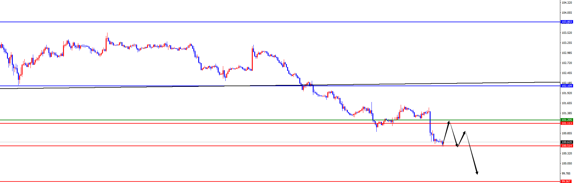 【美元指数】 美元指数方面,上周五美元指数价格总体呈现大幅下跌的状态。当日价格最高上涨至101.531位置,最低于100.575位置,收盘于100.647位置。回顾上周五美指价格表现,早间开盘后价格短线直接承压下跌,虽然欧盘期间价格短线直止步修正,但是美盘期间价格并没有实际突破当天早盘高点位置,随后再度承压大