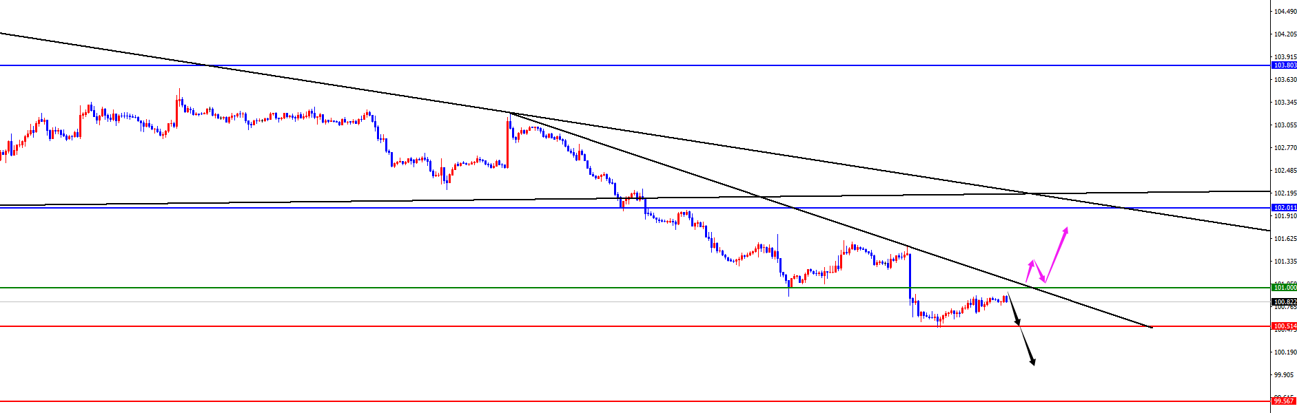 【美元指数】 美元指数方面,周四美元指数价格总体呈现上涨的状态。当日价格最高上涨至101.603位置,最低于101.051位置,收盘于101.497位置。回顾周四美指价格表现,早间开盘后价格短线获得支撑上行,最终晚间价格上破四小时阻力101.50位置,最终大阳状态收尾,针对昨日也是重点强调价格一旦上破则后续有望进一
