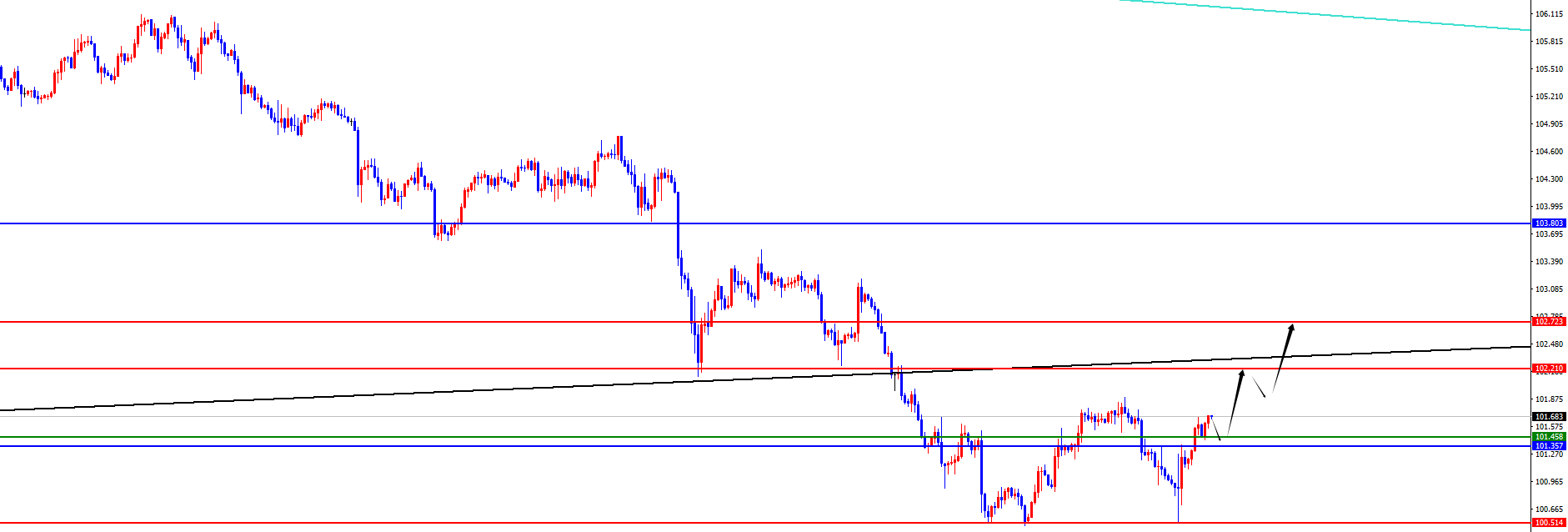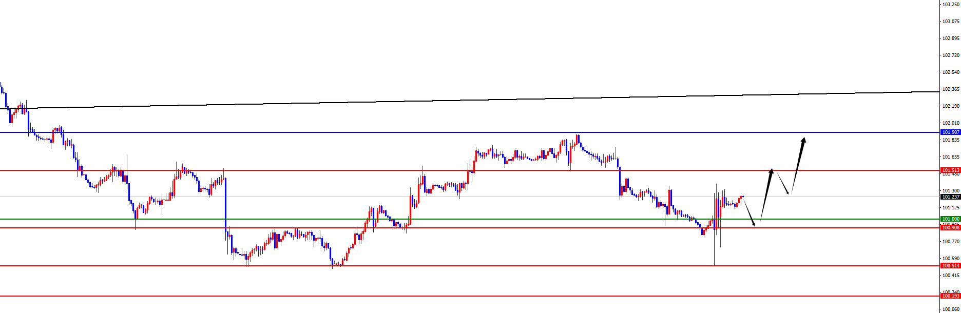 【美元指数】 美元指数方面,上周五美元指数价格总体呈现探底回升的状态。当日价格最高上涨至101.374位置,最低于100.525位置,收盘于101.164位置。回顾上周五美指价格表现,早间开盘后价格承压下跌,在周五收到非农数据影响,价格探底回升,价格没有下破近期低点,但是从最终收盘看价格收到日线阻力位置上方。