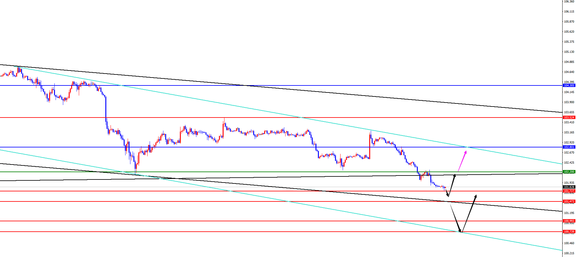 【美元指数】 美元指数方面,周一美元指数价格总体呈现下跌的状态。当日价格最高上涨至102.458位置,最低于101.825位置,收盘于101.845位置。回顾周一美指价格表现,早间开盘后价格短线震荡后再度承压,随后并在欧盘前跌破近期低点102.10位置,在首次跌破后短线修正后又弱势下跌,从收盘看于当天最低点位置附近
