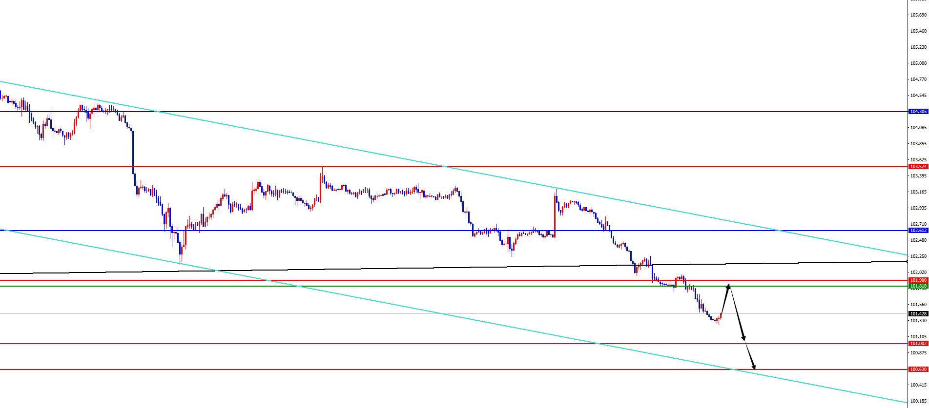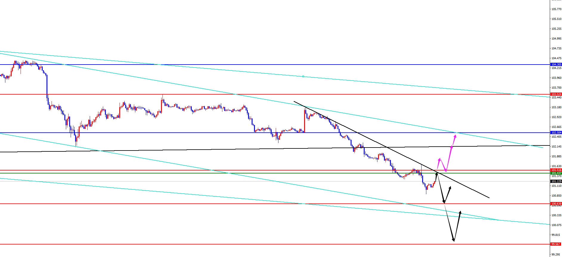 【美元指数】 美元指数方面,周二美元指数价格总体呈现下跌的状态。当日价格最高上涨至101.985位置,最低于101.335位置,收盘于101.344位置。回顾周二美指价格表现,早间开盘后价格短线震荡后修正,欧盘后价格再度承压下跌并且在美盘再度跌破早盘低点位置,最终日线日线级别大阴收尾。整体看目前美指依旧偏向空