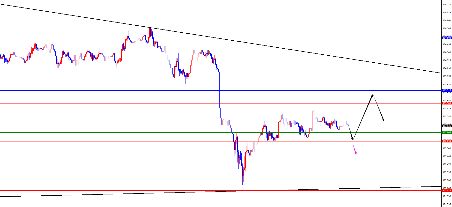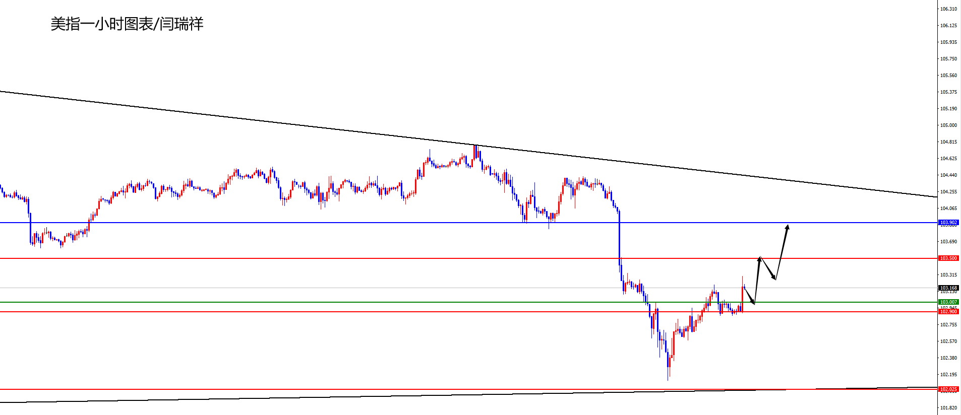 【美元指数】 美元指数方面,周四美元指数价格总体呈现大幅的状态。当日价格最高上涨至103.523位置,最低于102.887位置,收盘于103.19位置。回顾周四美指价格表现,早间开盘后价格向下修正后如期上行,价格也是顺利测试我们昨日强调的第一目标位置,但是隔夜期间价格持续修正,最终收盘阳十字收尾,对于昨日高