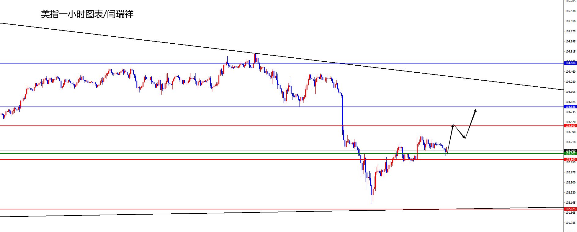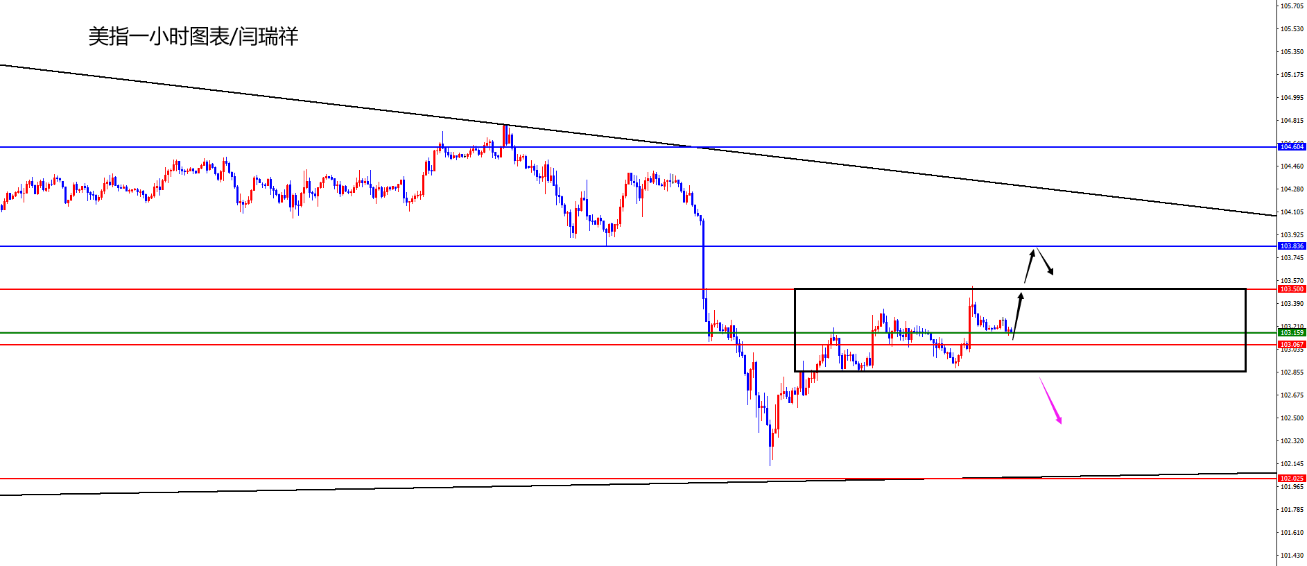 【美元指数】 美元指数方面,周三美元指数价格总体呈现上涨的状态。当日价格最高上涨至103.345位置,最低于102.87位置,收盘于103.156位置。回顾周三美指价格表现,早间开盘后价格短线震荡后如期上行,虽然欧盘及美盘没有再创新高,但是整体日线依旧大阳收尾,表明整体还是偏向多,毕竟下方周一低点是日线上涨