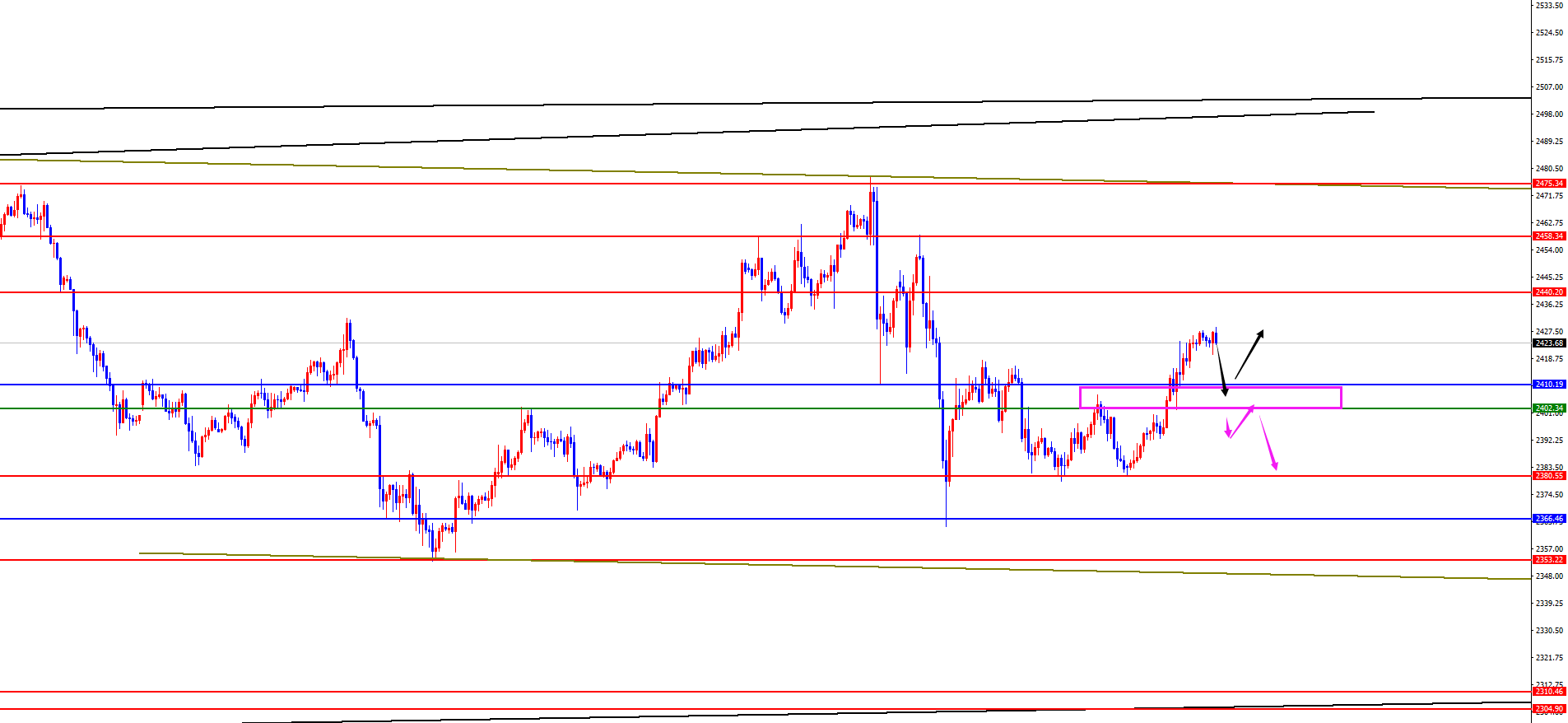 【黄金】 黄金方面,周四黄金价格总体呈现上涨的状态,当日价格最高上涨至2427.46位置,最低下跌至2380.81位置,收盘于2327.05位置。回顾周四黄金市场表现,早间开盘后价格短线获得支撑上行,欧盘前价格突破四小时阻力,这也就是昨日提及四小时阻力可以忽略的原因。随后美盘前价格突破日线阻力,所以整体节奏上
