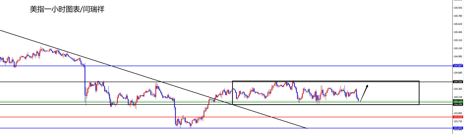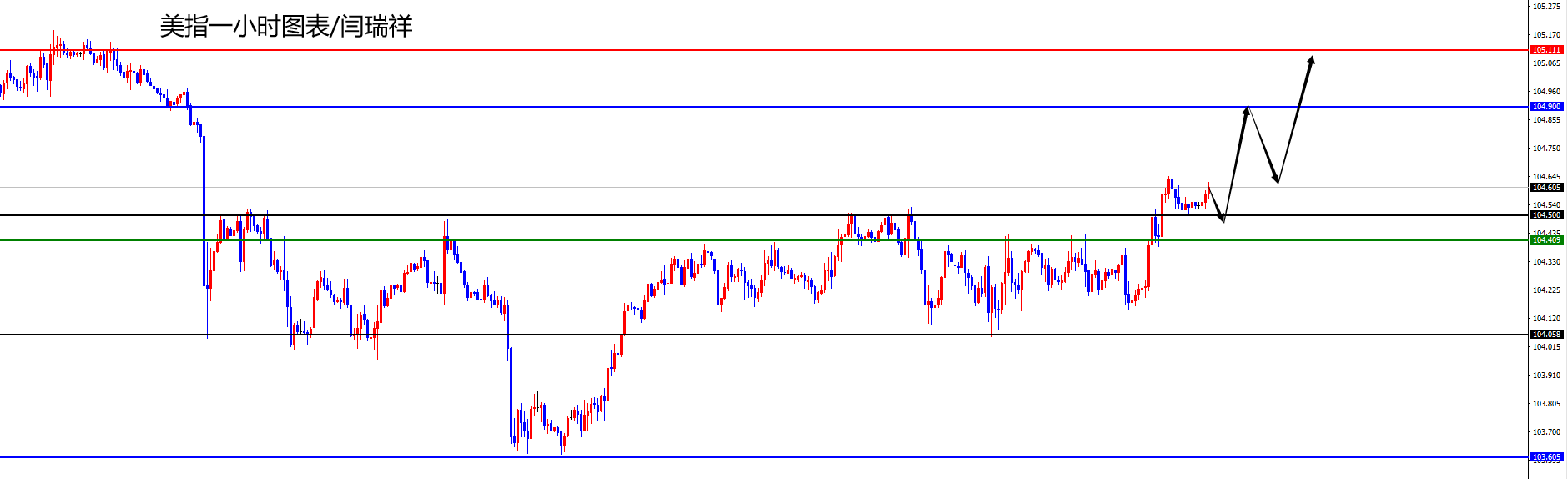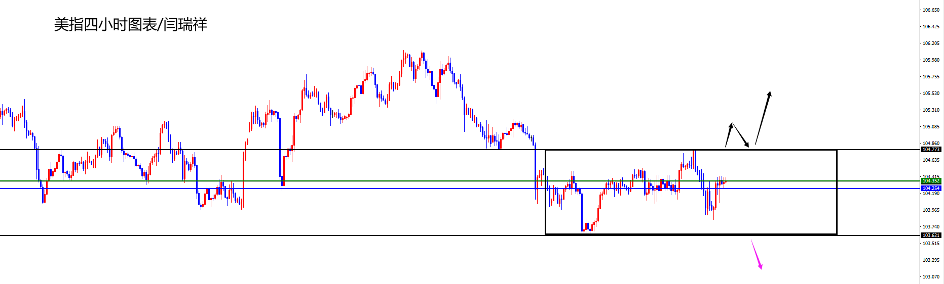 【美元指数】 美元指数方面,周一美元指数价格总体呈现如期上行的状态。当日价格最高上涨至104.728位置,最低于104.11位置,收盘于104.549位置。回顾周一美指价格表现,在昨日价格再度测试震荡区间下边缘后价格如期向上拉升,随后在美盘价格突破震荡区间上边缘位置,并且最终收盘在此位置上方。针对目前美指暂