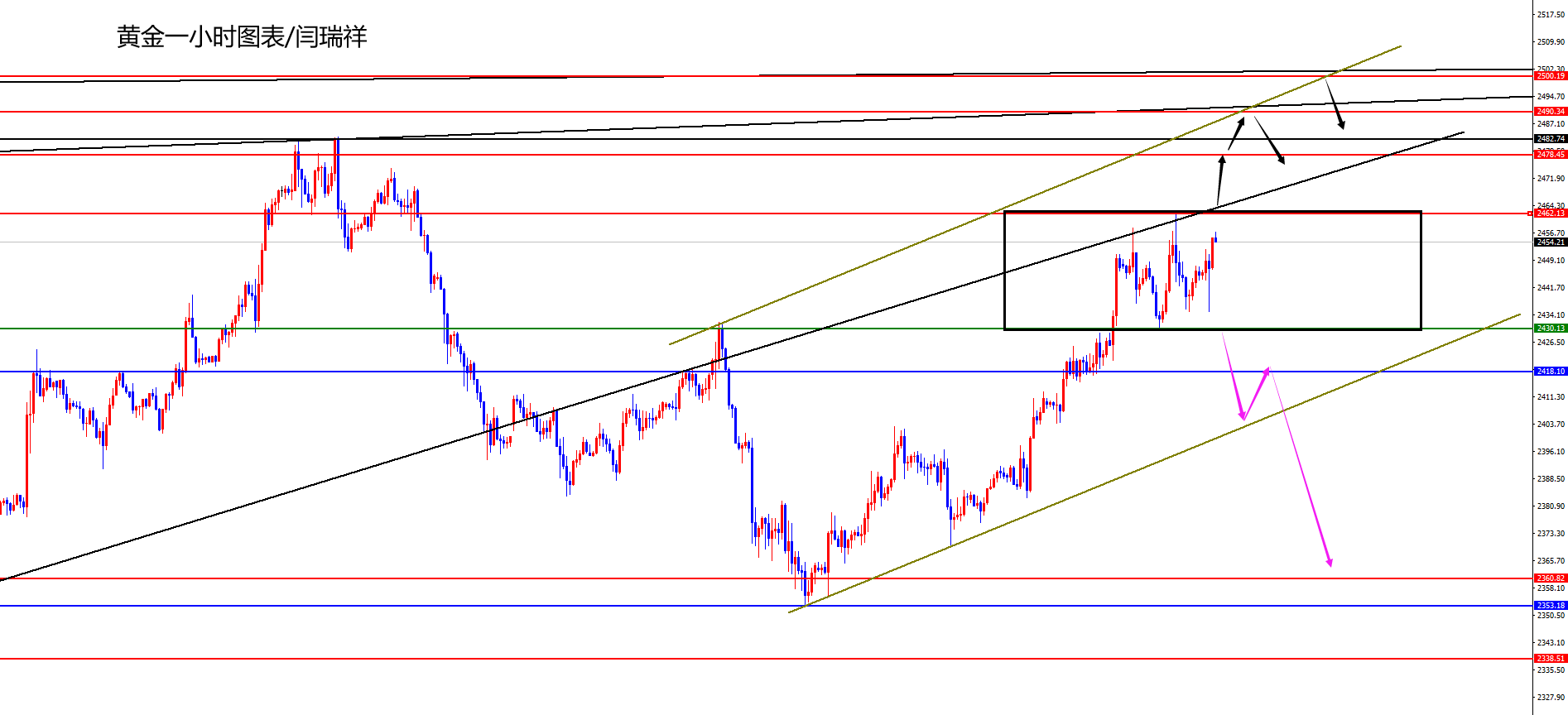 【黄金】 黄金方面,周四黄金价格总体呈现震荡的状态,当日价格最高上涨至2462.16位置,最低下跌至2430.1位置,收盘于2446.14位置。回顾周四黄金市场表现,昨日价格整体持续震荡为主,价格亚盘冲高没有延续,随后再度测试2430区域后止步冲高,但是晚间同样没有延续,最终收盘十字状态收尾。从目前走势上看2430