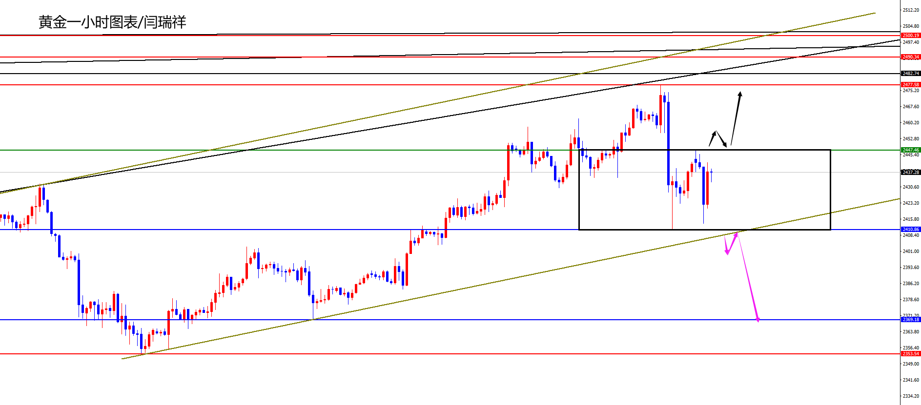 【黄金】 黄金方面,上周五黄金价格总体呈现冲高回落的状态,当日价格最高上涨至2477.56位置,最低下跌至2410.68位置,收盘于2441.28位置。回顾上周五黄金市场表现,早间开盘后价格依托四小时支撑持续上行,日内一直延续上涨表现,同时非农数据公布后黄金伺机上行,但是触及至2477.56位置后承压并快速下跌,价