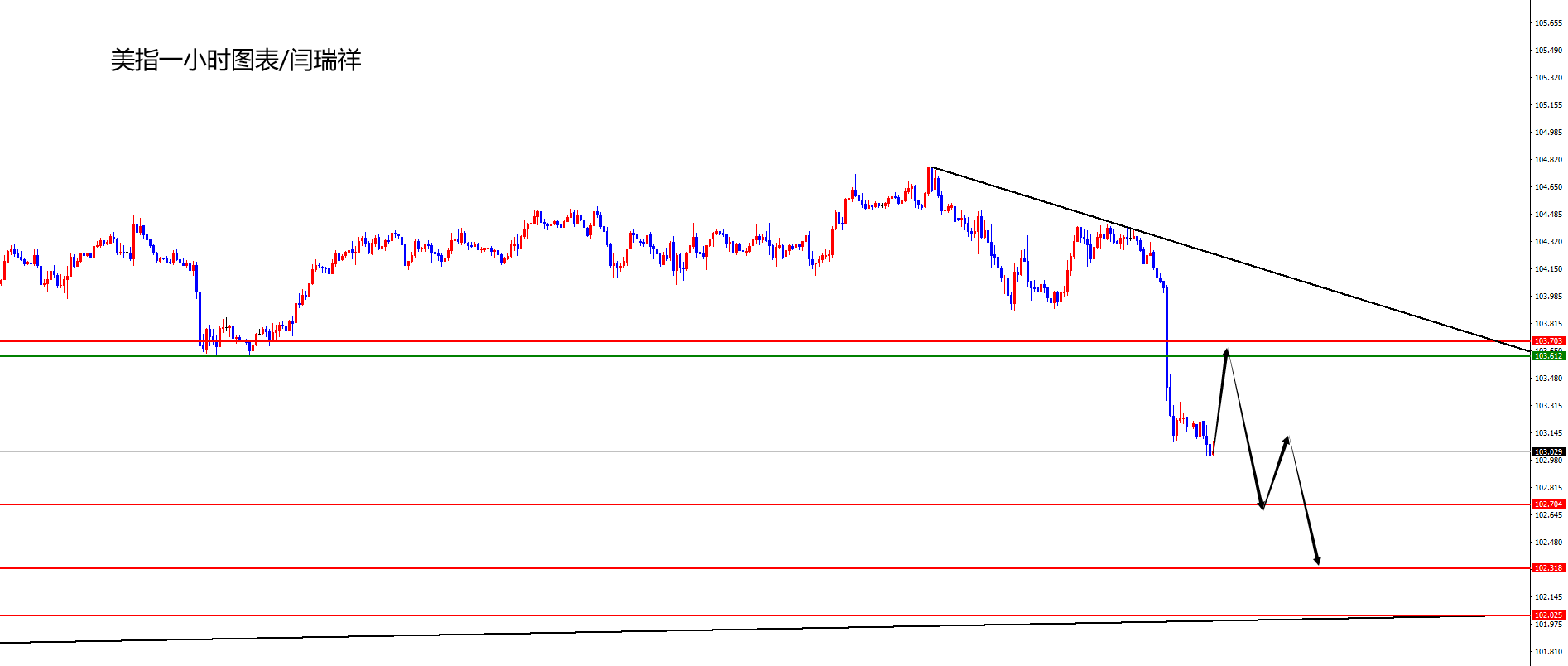 【美元指数】 美元指数方面,上周五美元指数价格总体呈现弱势下跌的状态。当日价格最高上涨至104.403位置,最低于103.094位置,收盘于104.204位置。回顾上周五美指价格表现,早间开盘后价格短线震荡为主,随后价格持续承压下跌,晚间受到非农数据影响,价格一路加速下行,并且最终收盘在低位,目前看周线级别大