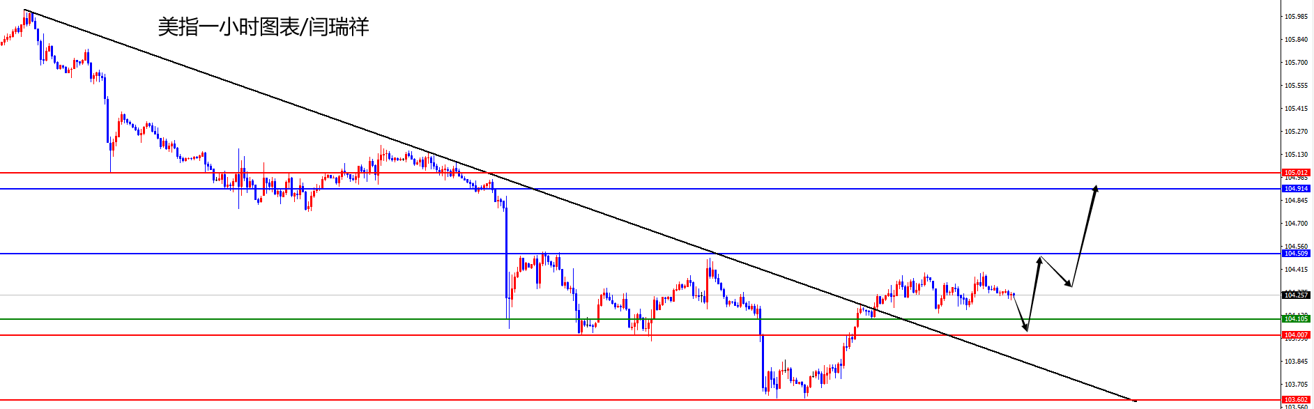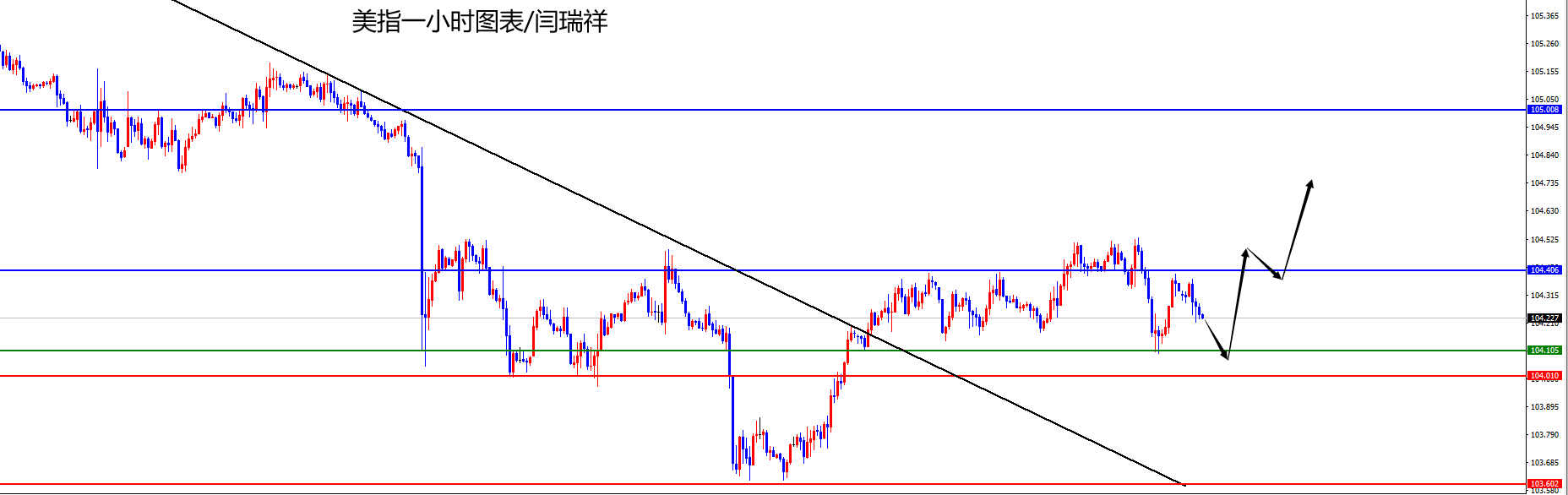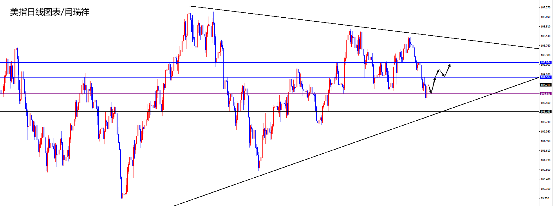【美元指数】 美元指数方面,周三美元指数价格总体呈现下跌的状态。当日价格最高上涨至104.272位置,最低于103.619位置,收盘于103.707位置。回顾周三美指价格表现,早间开盘后价格短线震荡为主,随后欧盘价格快速大幅承压下跌,价格跌破月线级别关键支撑位置,随后晚间价格再度震荡收盘,日线上最终大阴收尾。