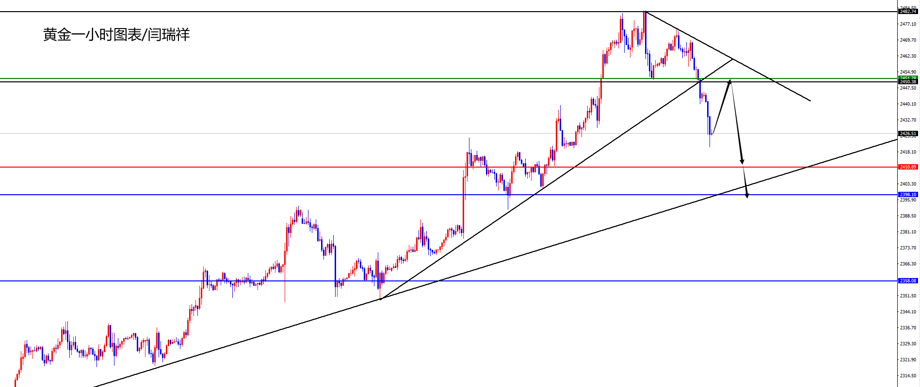 【黄金】 黄金方面,周三黄金价格总体呈现冲高回落的状态,当日价格最高上涨至2431.86位置,最低下跌至2396.62位置,收盘于2397.08位置。回顾周三黄金市场表现,在日内价格先向上拉升,晚间价格测试到2430区域如期承压,市场走势正如笔者所言,隔夜期间价格一路下跌跌破日线及四小时支撑区域,并且最终大阴收尾